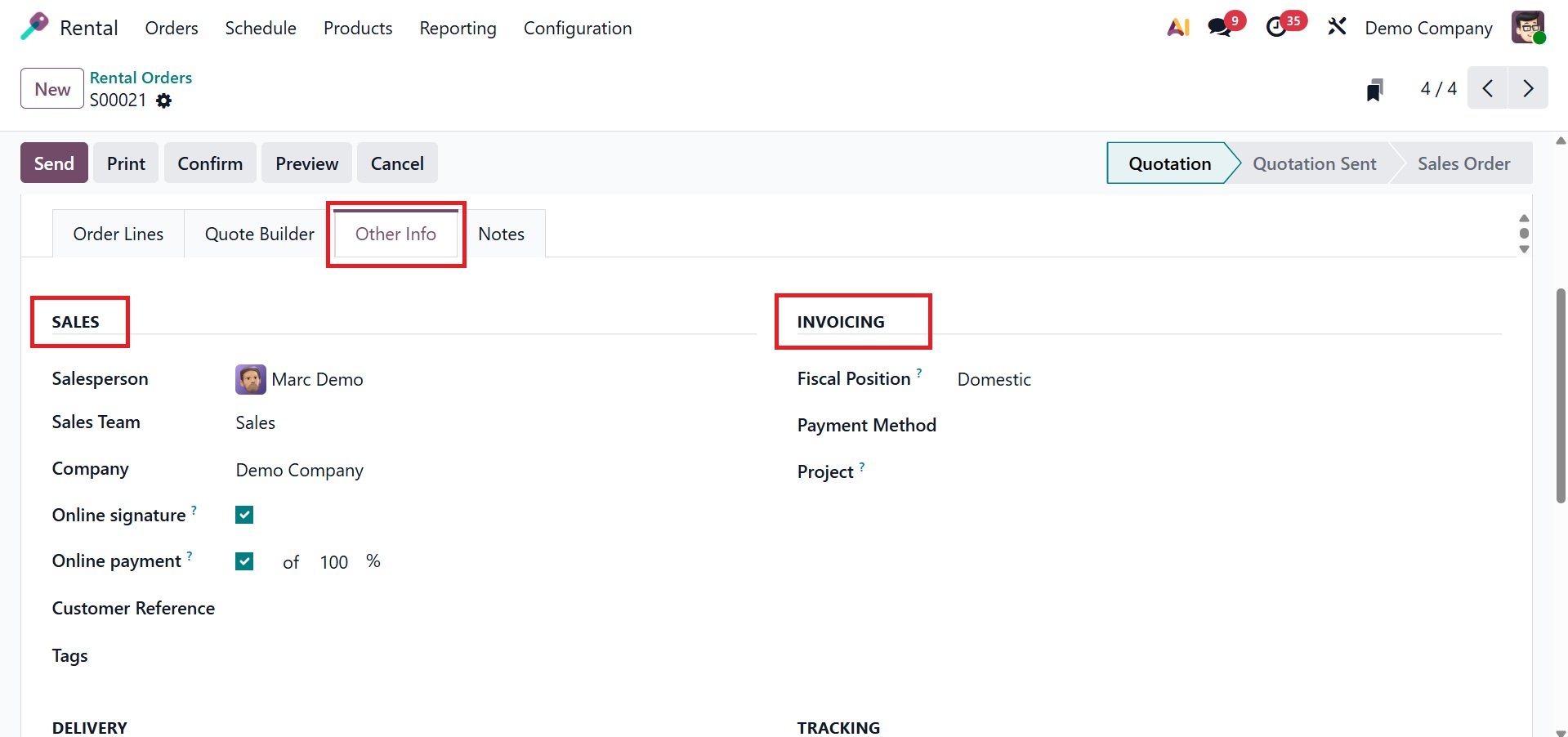 Other Info is the next tab, and it has choices for sales, invoicing and payment, deliveries, and tracking. The following information is included in the SALES section: salesperson, sales team, company name, and confirmations of online payments and signatures to activate, Customer reference, tags, and print variant grids.