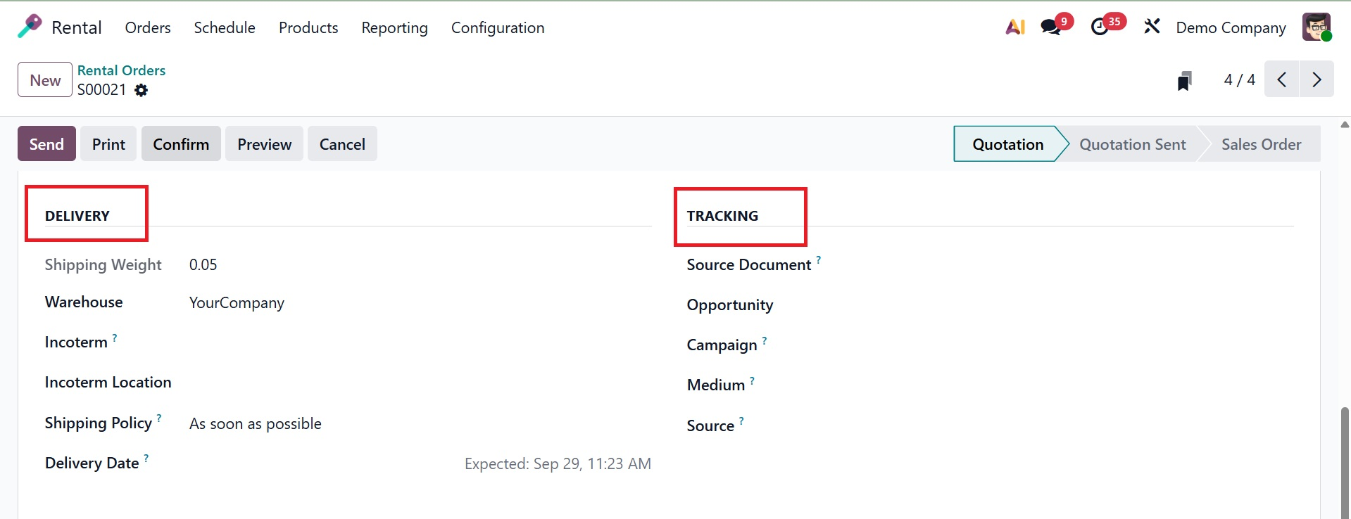 You may access the Fiscal Position, payment method, invoicing journal, and Project, which assist in the administration of analytical accounting and tax requirements, in the INVOICING area, as in the screenshot above. The Fiscal Position determines the tax rules that apply to a rental order based on the client's location, tax exemptions, or specific fiscal policies. The Project field links the rental order to an Odoo Project in order to manage rental income, costs, and resource allocations for specific business operations. You may now select the Shipping Weight, Warehouse, Incoterm, Incoterm Location, Delivery Date, and Shipping Policy under the DELIVERY option, as shown below.
