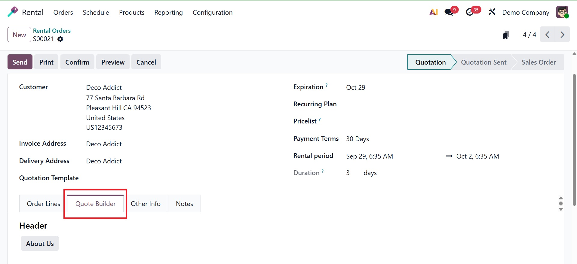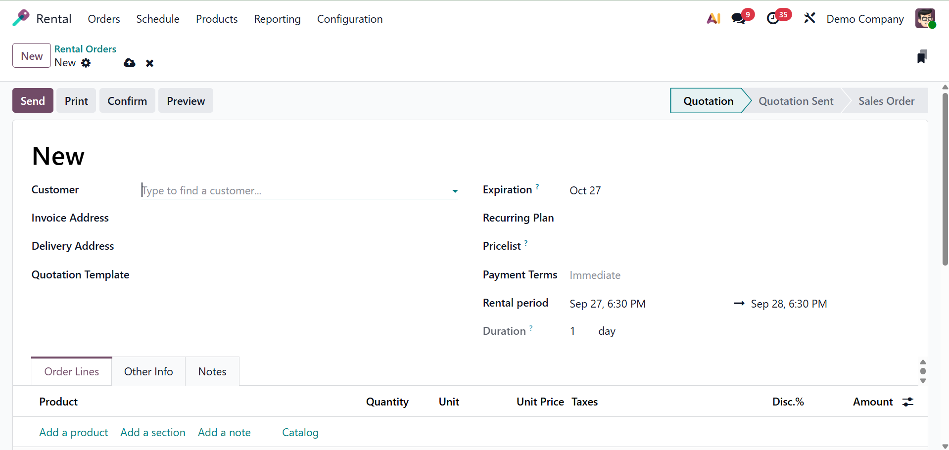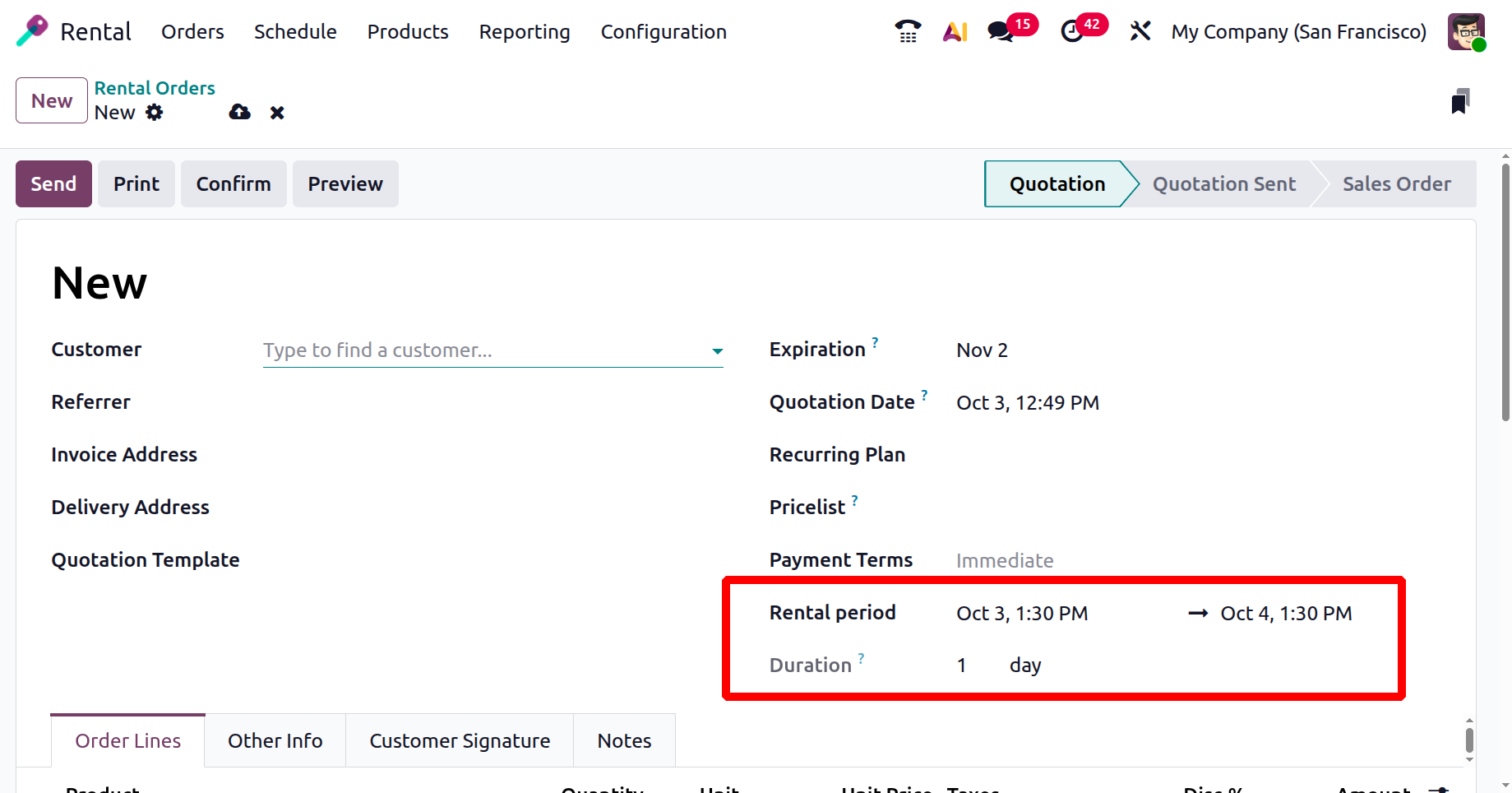 The customer's name, the invoice and delivery addresses, the expiration and recurring plan, the price list, and the payment term are all entered on the creation page. The quotation template can be added then. The Rental Period and Duration choices allow businesses to choose the start and end dates of a rental, ensuring proper scheduling, pricing, and availability tracking.