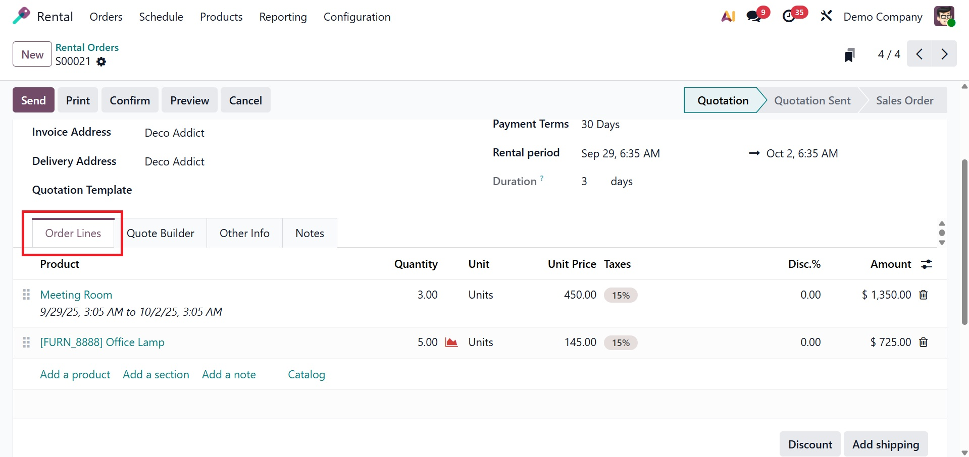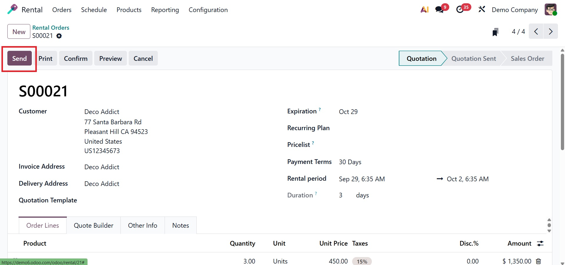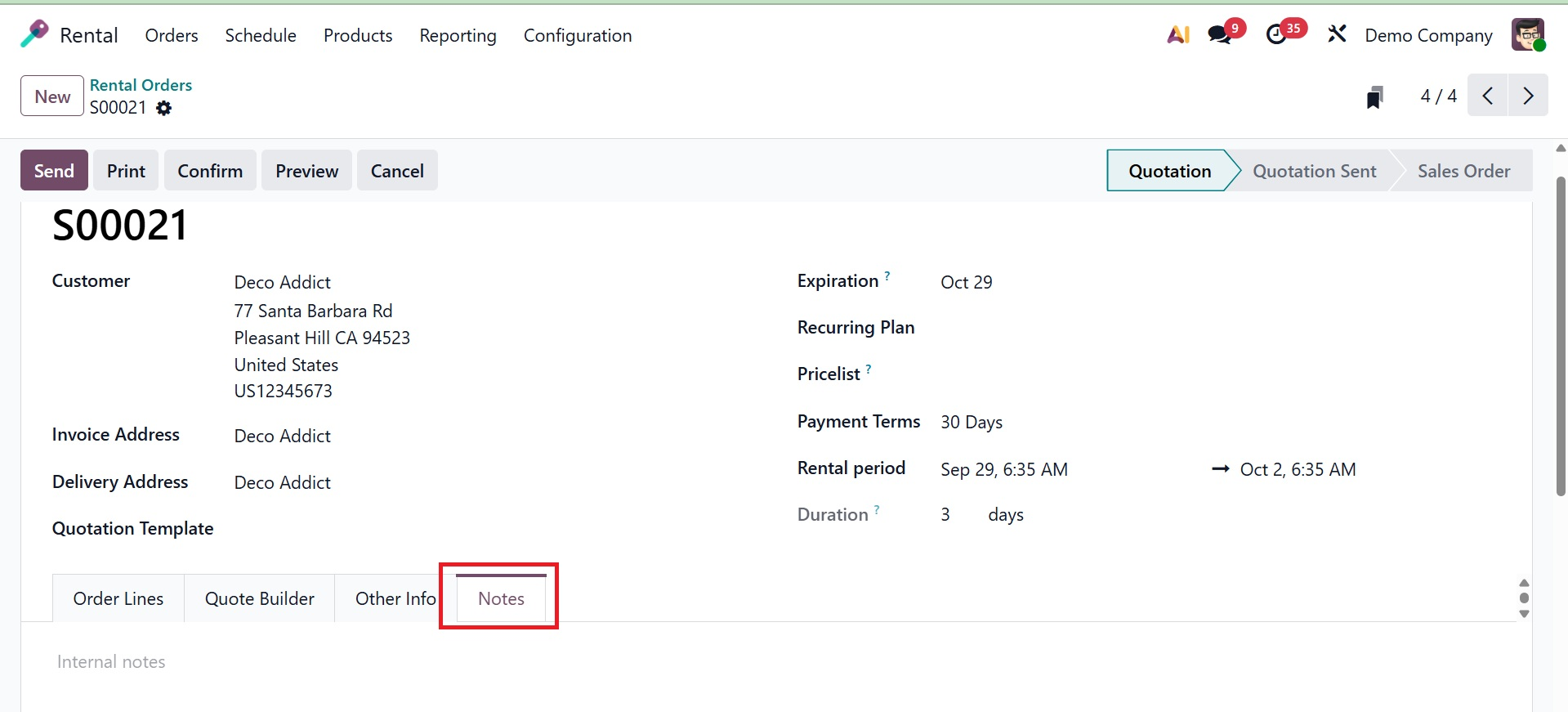 The customer's name, the invoice and delivery addresses, the expiration and recurring plan, the price list, and the payment term are all entered on the creation page. The quotation template can be added then. The Rental Period and Duration choices allow businesses to choose the start and end dates of a rental, ensuring proper scheduling, pricing, and availability tracking.