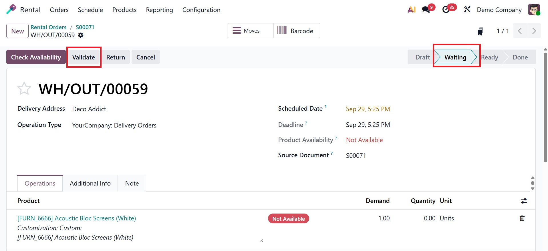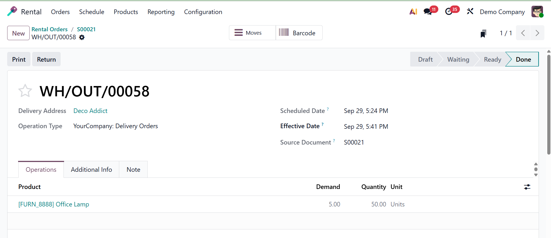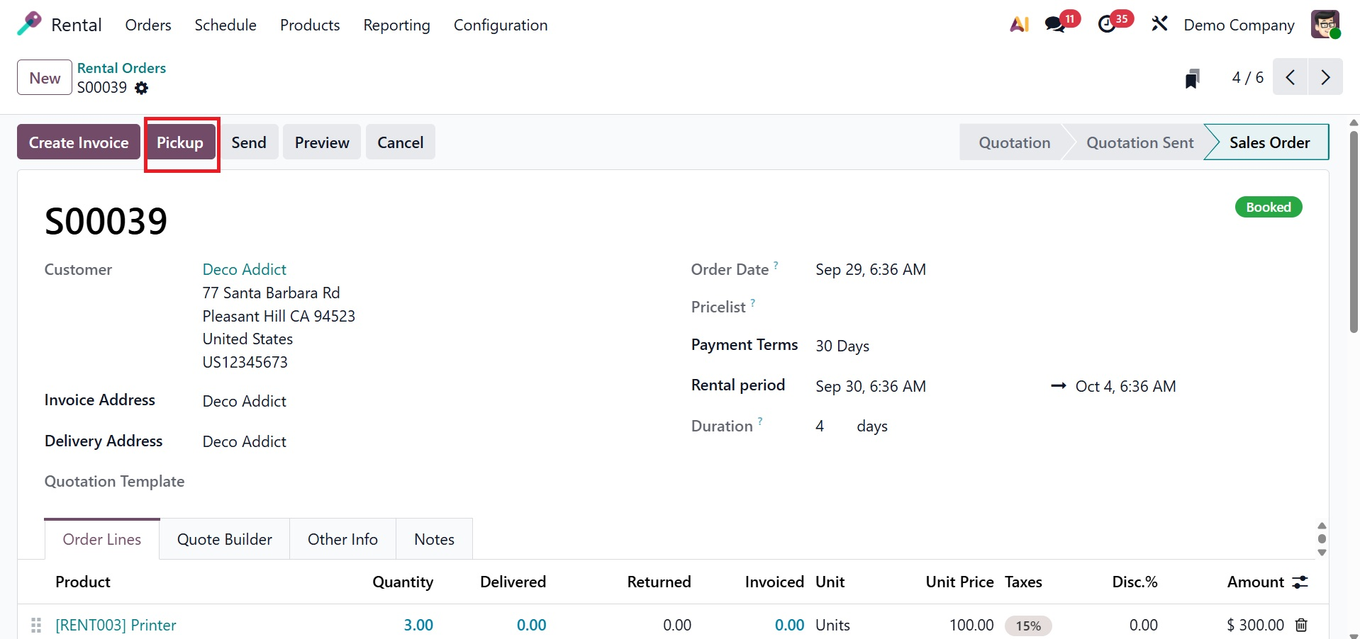 The rented items are moved from your warehouse to the consumer during the Pickup phase, which initiates a stock transfer.