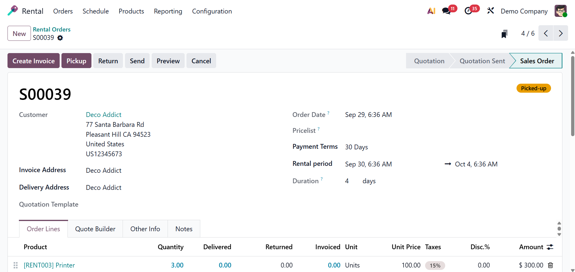 Now, back to the sales order page, there, using the pick up option, Odoo allows you to handle both the first Pickup (when the customer picks up or you deliver the products) and subsequent Return (when the items are returned) when you validate a rental order.