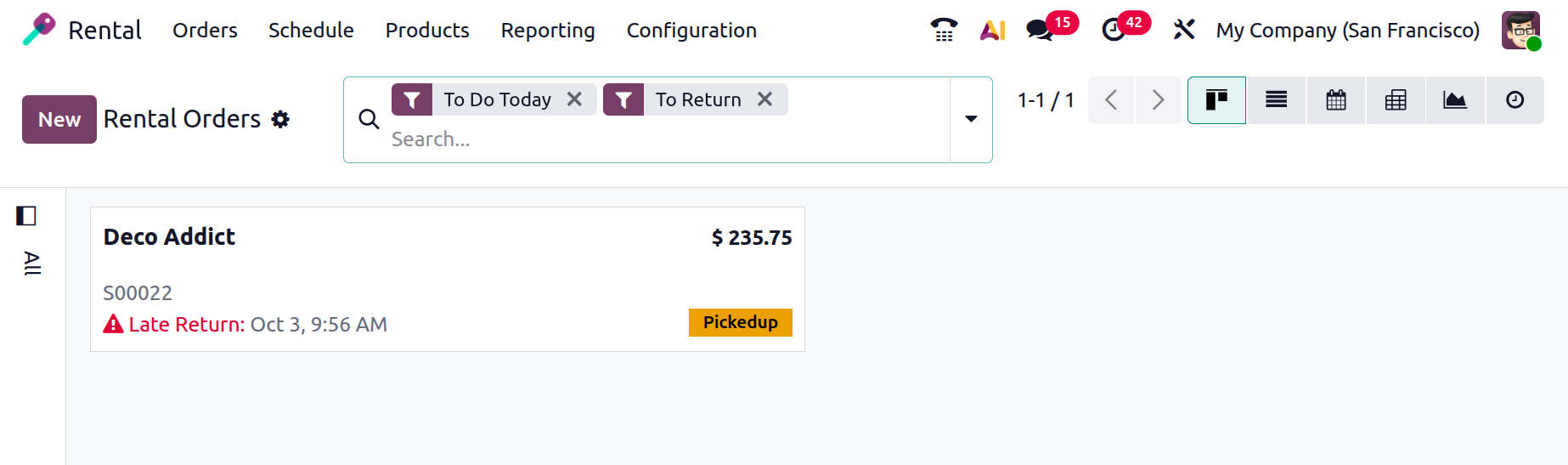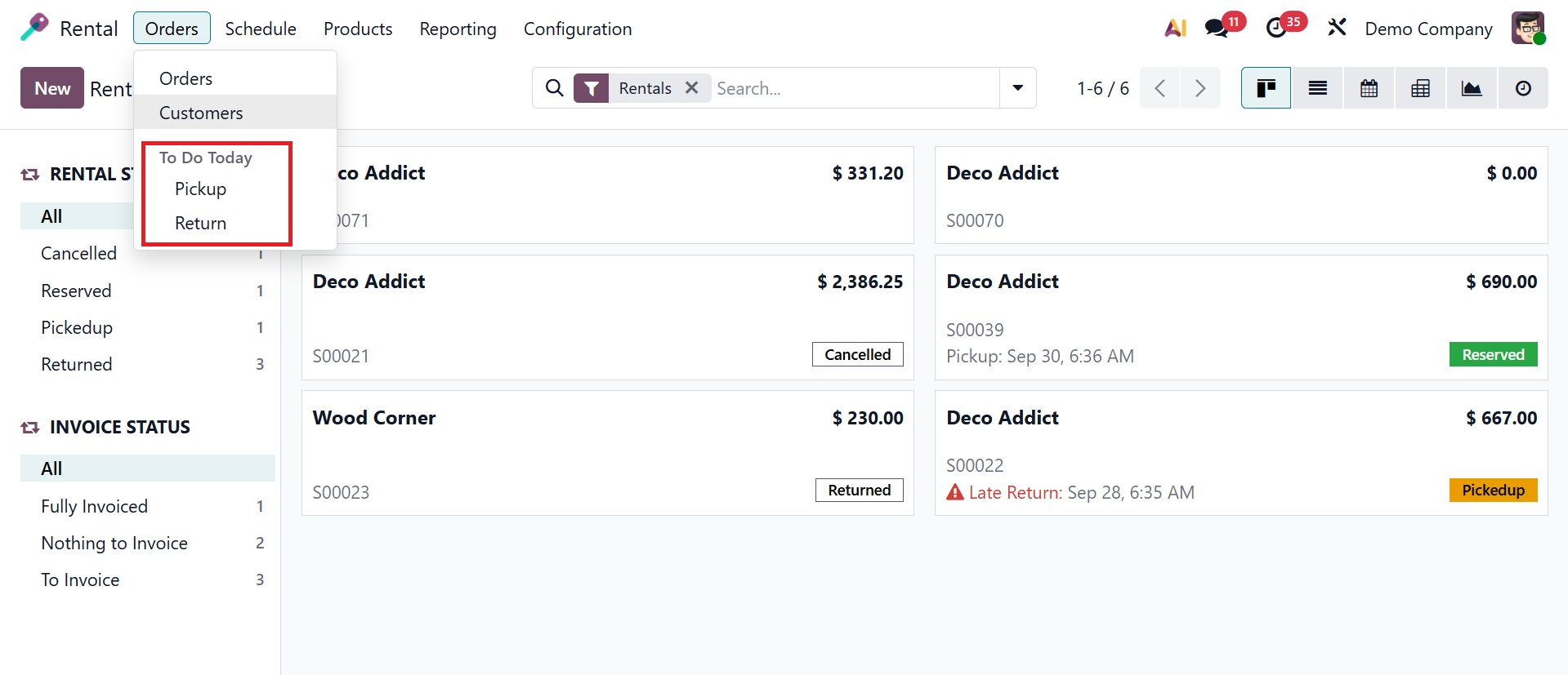 The items that have been returned after the rental time are displayed on the return option. Rental orders with returnable items that are due today are shown in the return lists.