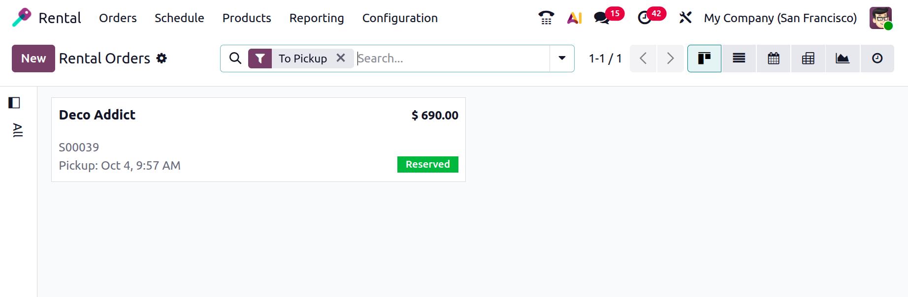 All rental orders with planned product pickups for today are listed under Pickup. Which means details about the product that has to be picked up are provided on the pickup page as shown below.