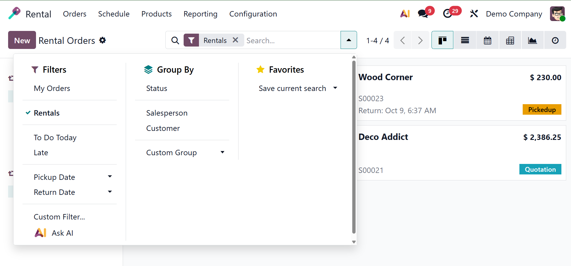 The filters include my orders, rentals, todo today, late, pickup date, return date, custom filter, and ask AI. under the group by, you have the options like, status, salesperson, customer, and custom group, respectively. The favorites option can also be made use of.