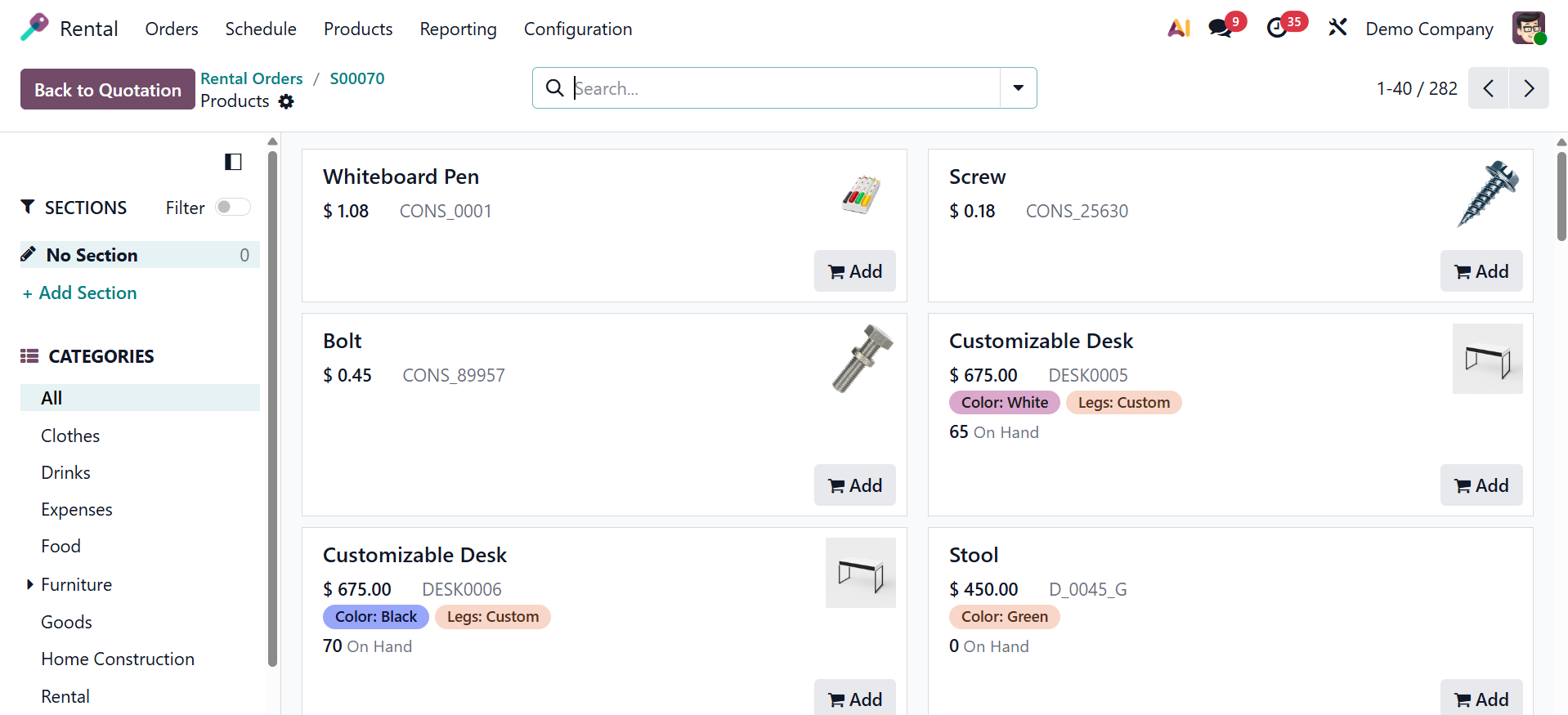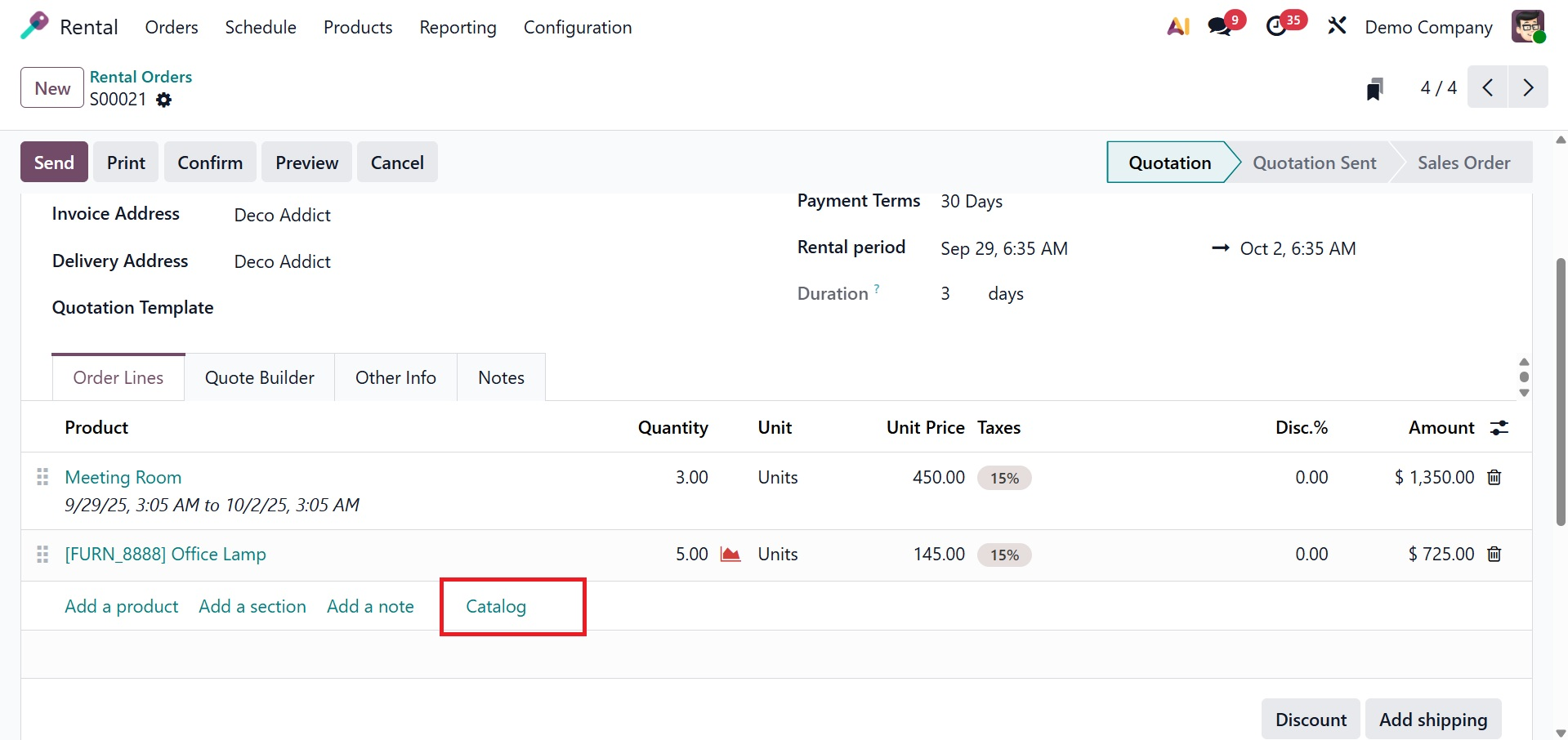 Add a Section allows users to add sections inside the order line, and the Add a Note allows users to add some additional notes. Users can access the Product Catalog page by selecting the Catalog option in the Orderline, as shown below. Users have categories for every product category and feature to make item selection simpler for customers.