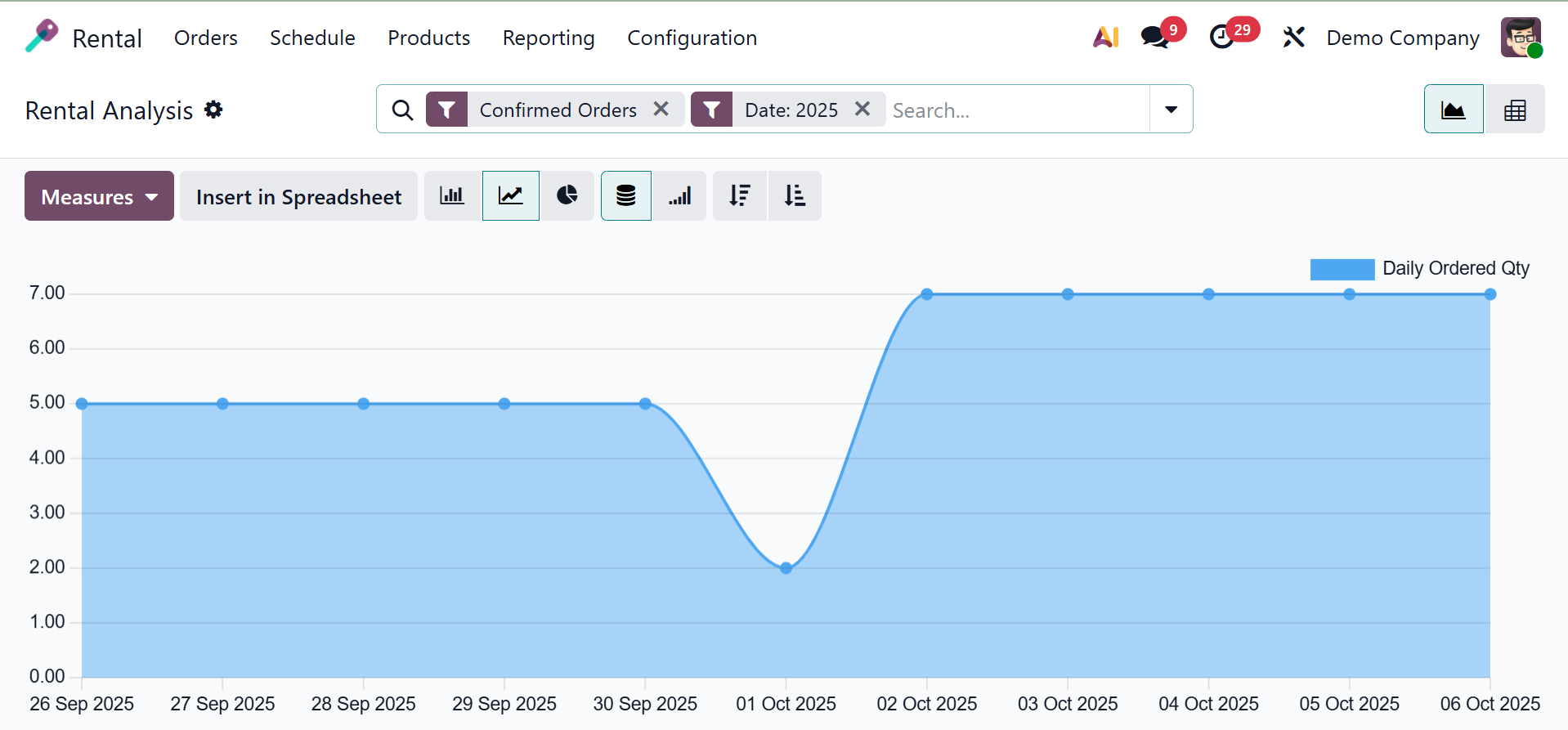 As you can see, the rental order reports are displayed graphically on the page. You have the Pivot view of the page in addition to the graphical view. Daily quantity, daily ordered quantity, daily picked-up quantity, and daily returned quantity are examples of metrics that can be used. Another option is to display the graph based on the count. To categorize them in accordance with our requirements, you can apply certain filters and group by options. By selecting the star icon on the site, you can mark them as favorites. Even better, you may contrast the current report with the previous one.