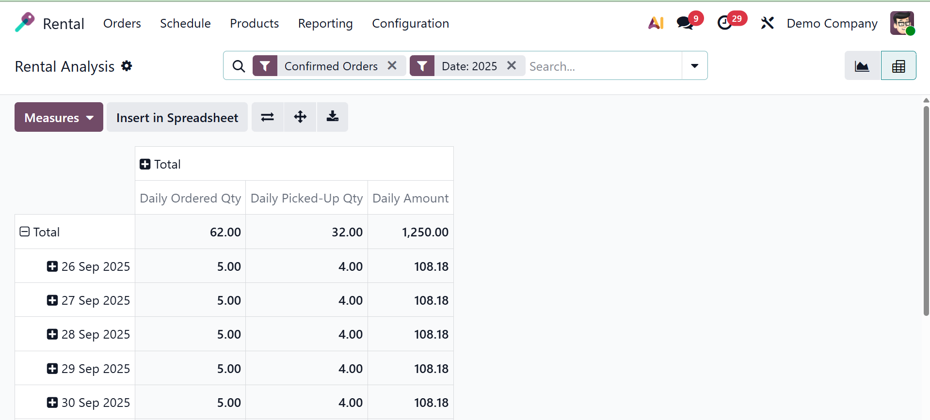 The Reporting option, which may be used to perform a thorough study of the rental product, is displayed on the module's home page. You can get details on rental orders that are placed on a daily, weekly, monthly, and annual basis by using the reporting option. The reporting page will look like this.