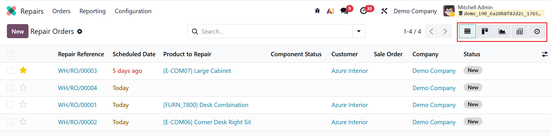 By default, when you open the Repairs module, you can see a list of repair orders in the dashboard. Here, you can view the details of the repair orders, including Repair Reference, Scheduled Date, Product to Repair, Component Status, Customer, Sales Order, Company, and Status.