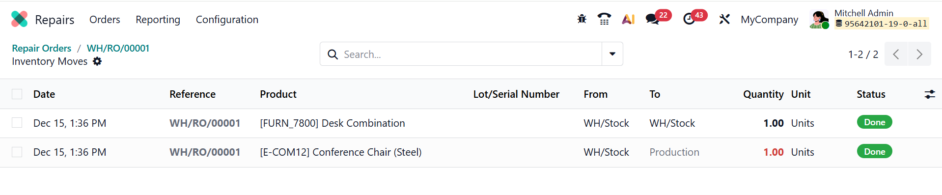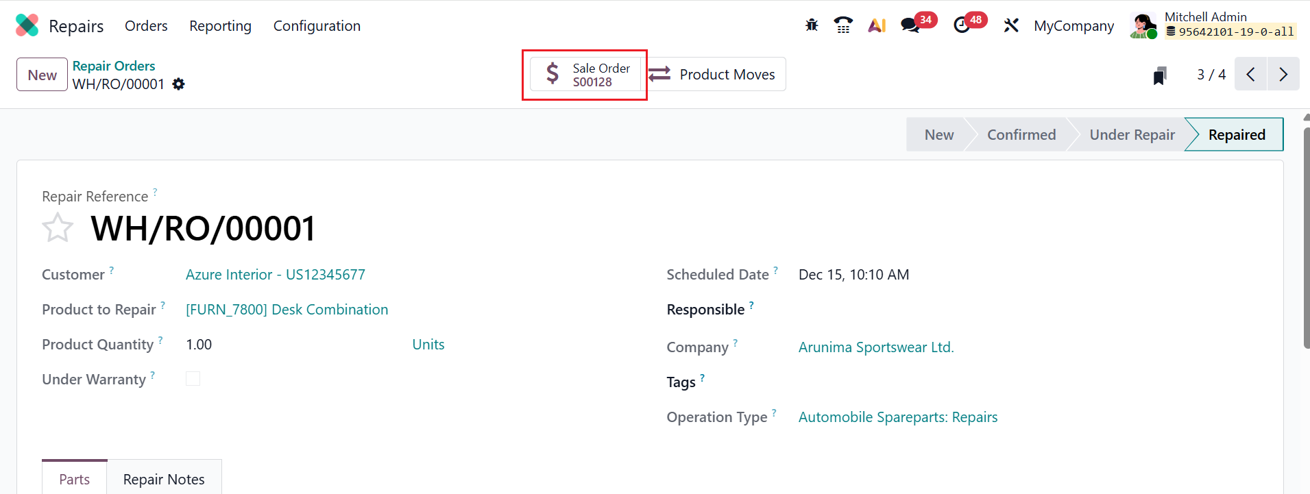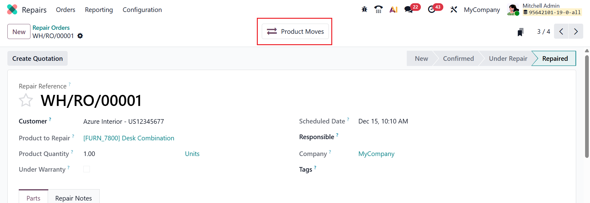 Here, you can see the repair order is in the Repaired stage. The Product Moves smart tab shows product movements after the repair order is placed.