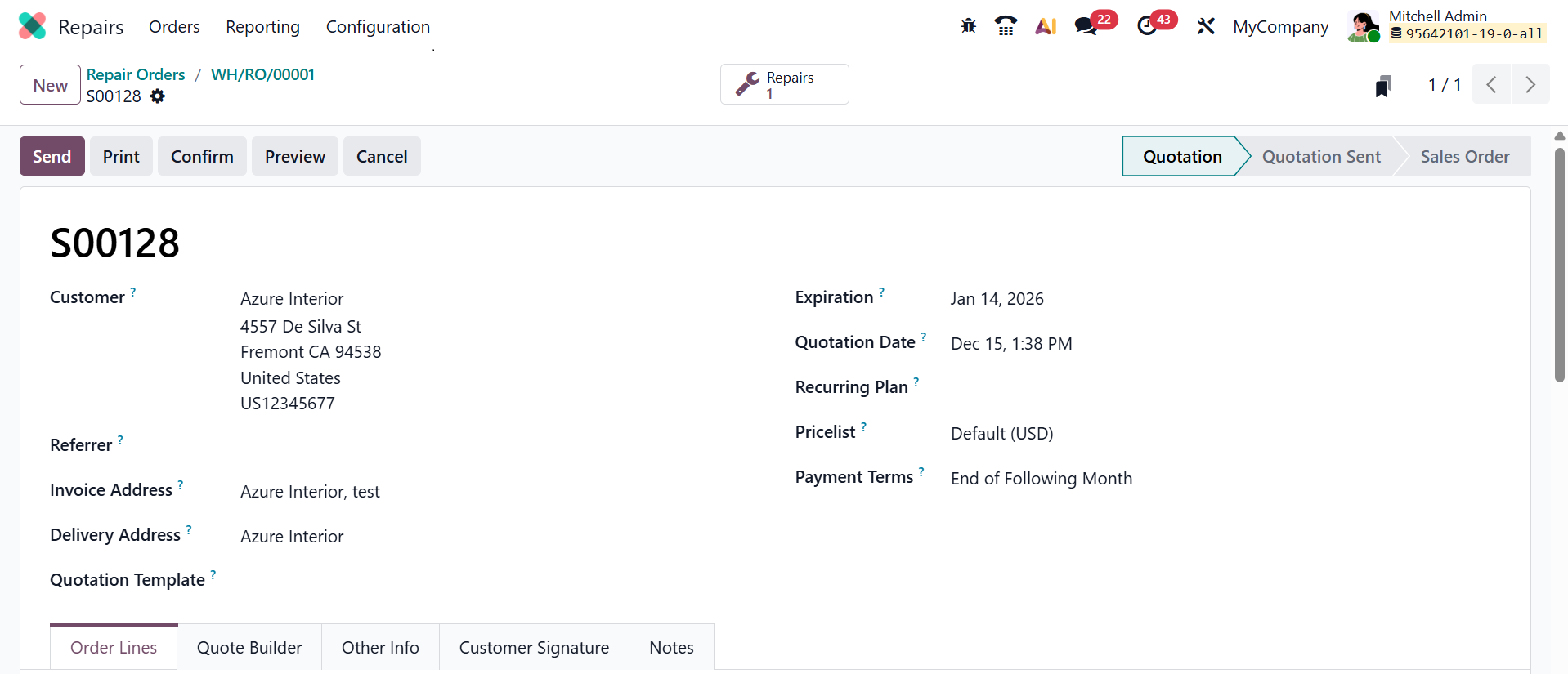 When you click on the Create Quotation button after completing the repair, the repair order will directly convert into a new quotation, as shown below: