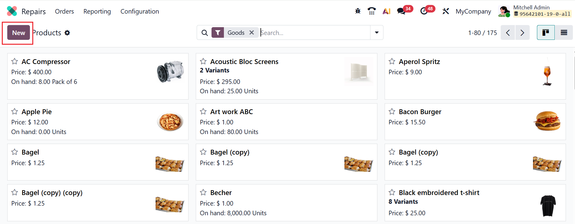 The Products option under the Configuration menu helps to define and manage the parts and services that can be added to a repair order. In a kanban dashboard view, you can see a detailed product catalog, including the product name, price, and quantity, as shown below. To add a product, click the New button or choose an existing product from the list.