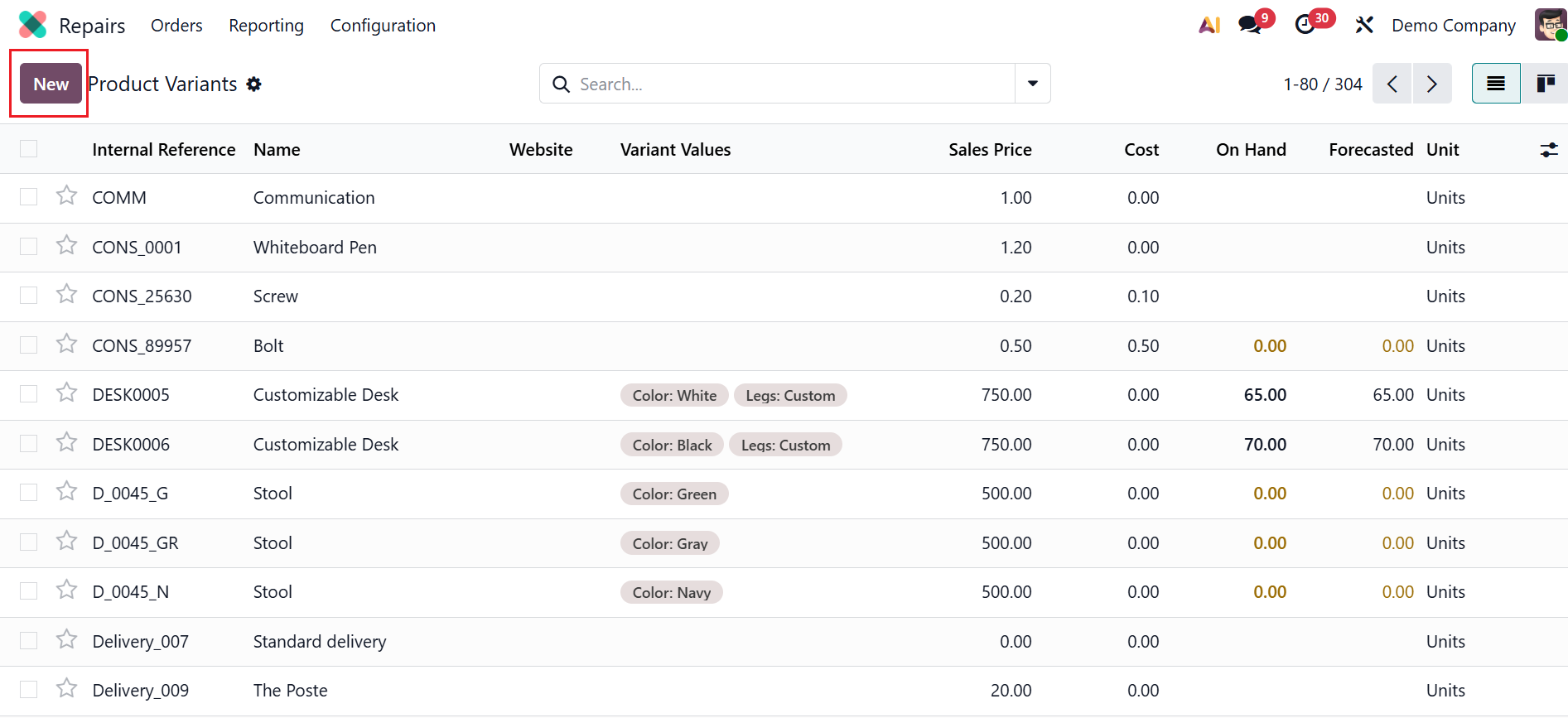 The Product variants option allows you to manage variants of the same product within a single product template. These variants help you select the exact part or item needed for a repair. Click on the New button to create a new product variant or select an existing one from the list as shown below: