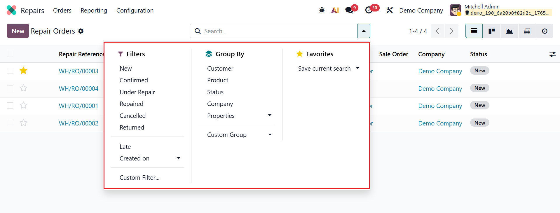 Click the drop-down menu in the search bar to see the available options: Filters, Group By, and Favorites. Under Filters, you can select options such as New, Confirmed, Under Repair, Repaired, Cancelled, Returned, Late, Created On, and Custom Filter. Under Group By, you can organize results by Customer, Product, Status, Company, Properties, or create a Custom Group. Under Favorites, you can save your search for future use.