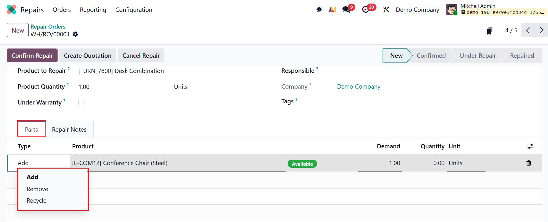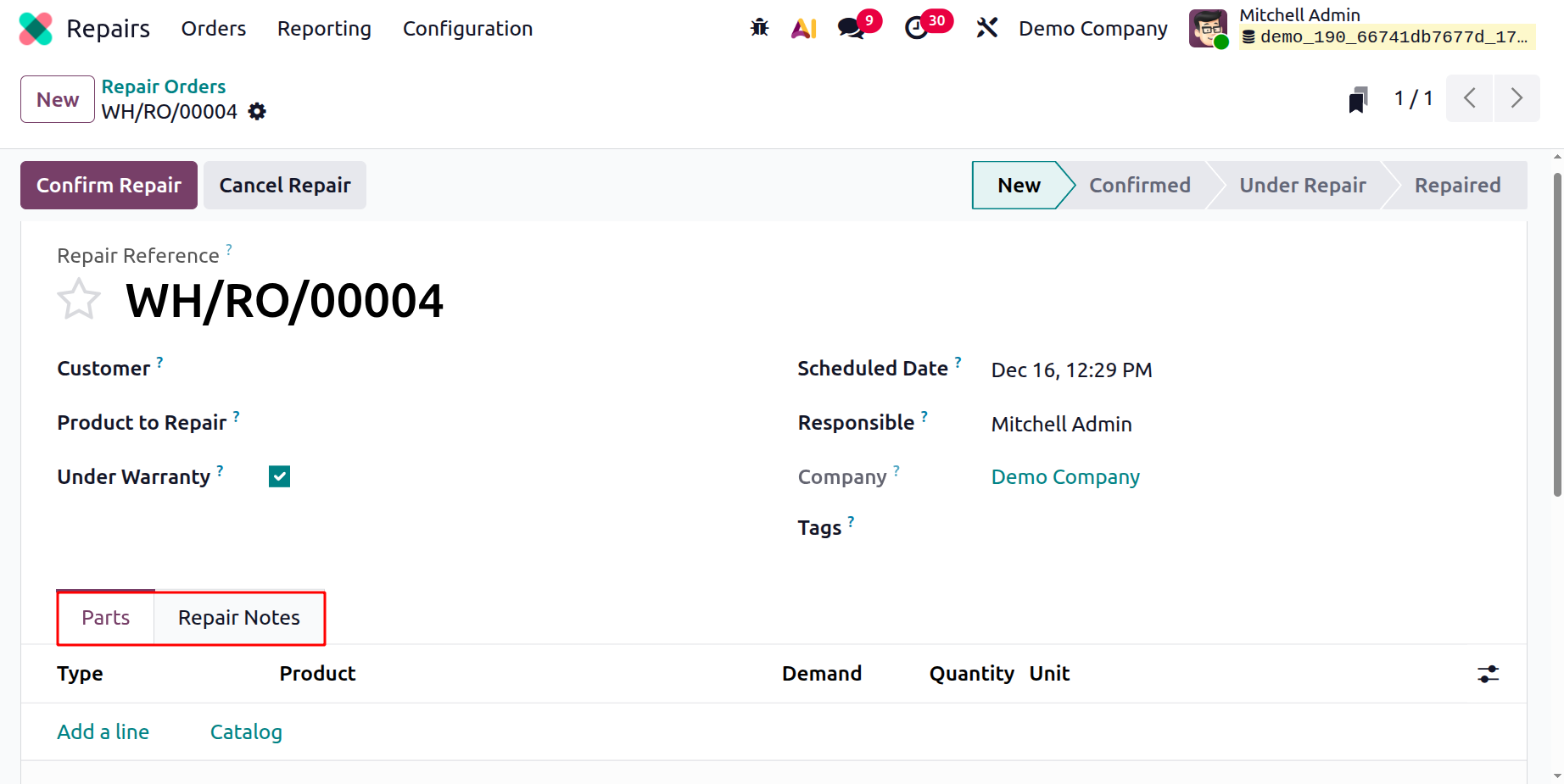 Based on the priority of the order, mark the star under the Repair Reference field. Here, you can see two tabs: Parts and Repair Notes.