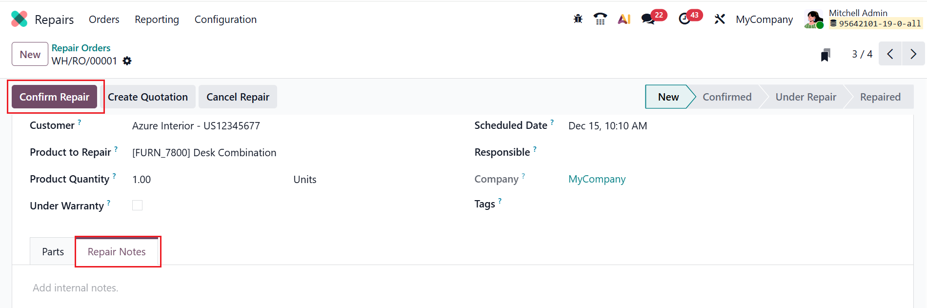 Under the Repair Notes tab, add internal notes about the RO. Then click the Confirm Repair button to confirm the repair order; it moves to the Confirmed stage.