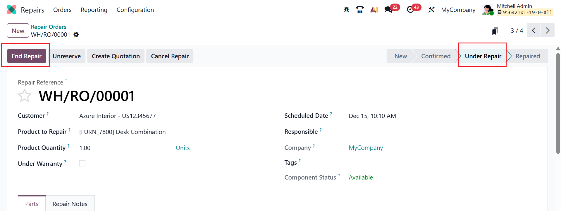 To begin the repair process, click the Start Repair button. While the repair is ongoing, the repair order is in the Under Repair stage. Once the process is complete, click the End Repair button to close the repair.