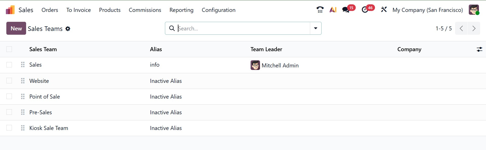 You may see the sales teams that are already set up on this platform, together with details like the team's name, alias, team leader, and company. Using the New button, you can quickly create a new team to manage your sales activities.