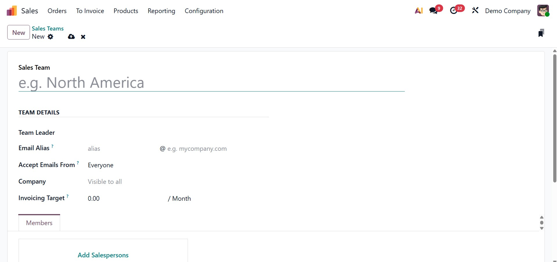 You can assign a worker to the role of Team Leader under "Team Details." Next, set up a custom domain to use as your email alias in the designated field. This sales team can accept emails from Authenticated Employees, Followers only, Authenticated Partners, or Everyone, depending on the option you select in the Accept Emails From section. The company linked to the sales team can be specified in the relevant area. In the invoicing target box, you can select the monthly income goal.