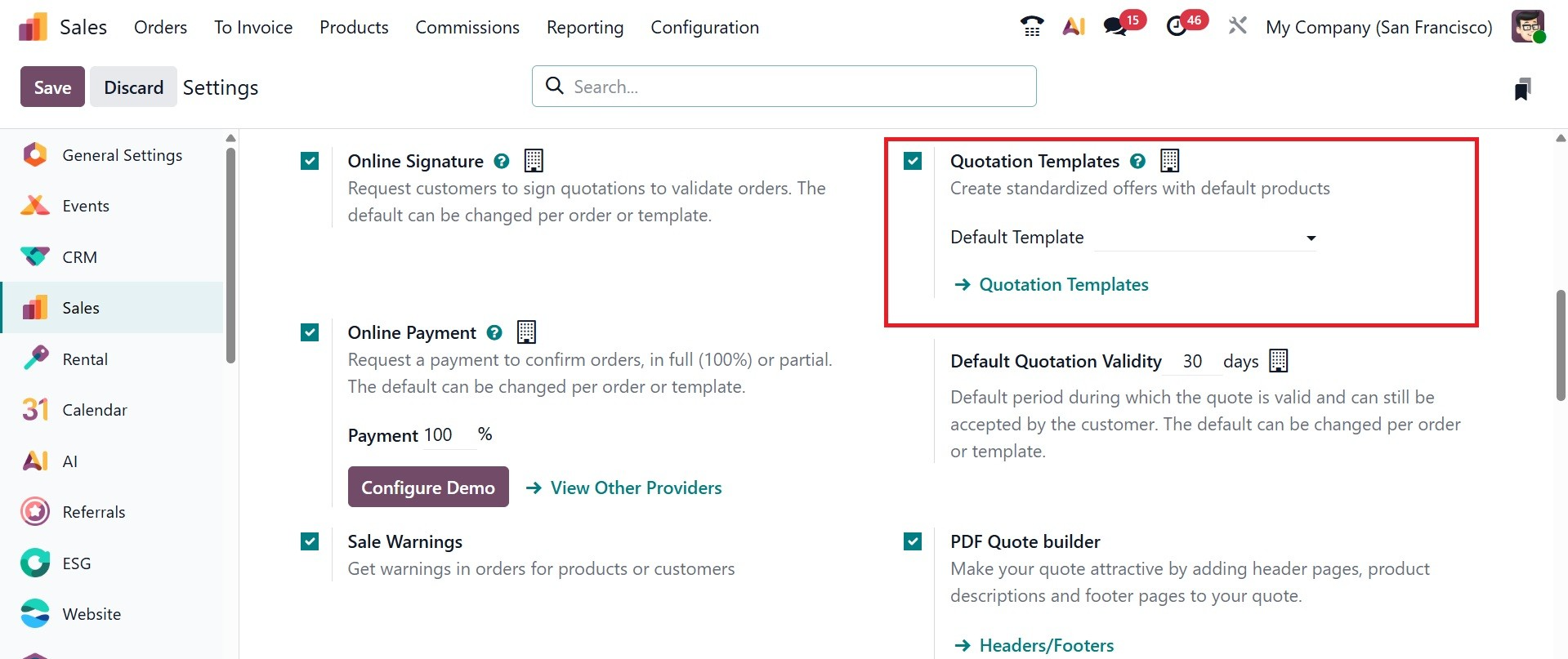To use the platform for creating quotation templates, you must enable the Quotation Templates option from the Sales module's Settings menu.