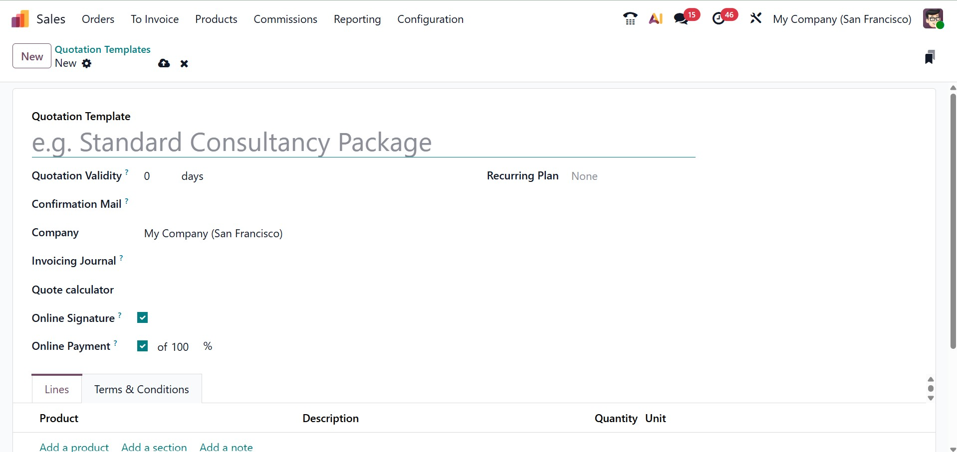 - Company: To indicate which company this quotation template applies to in a multi-company setting, utilize the Company field.
