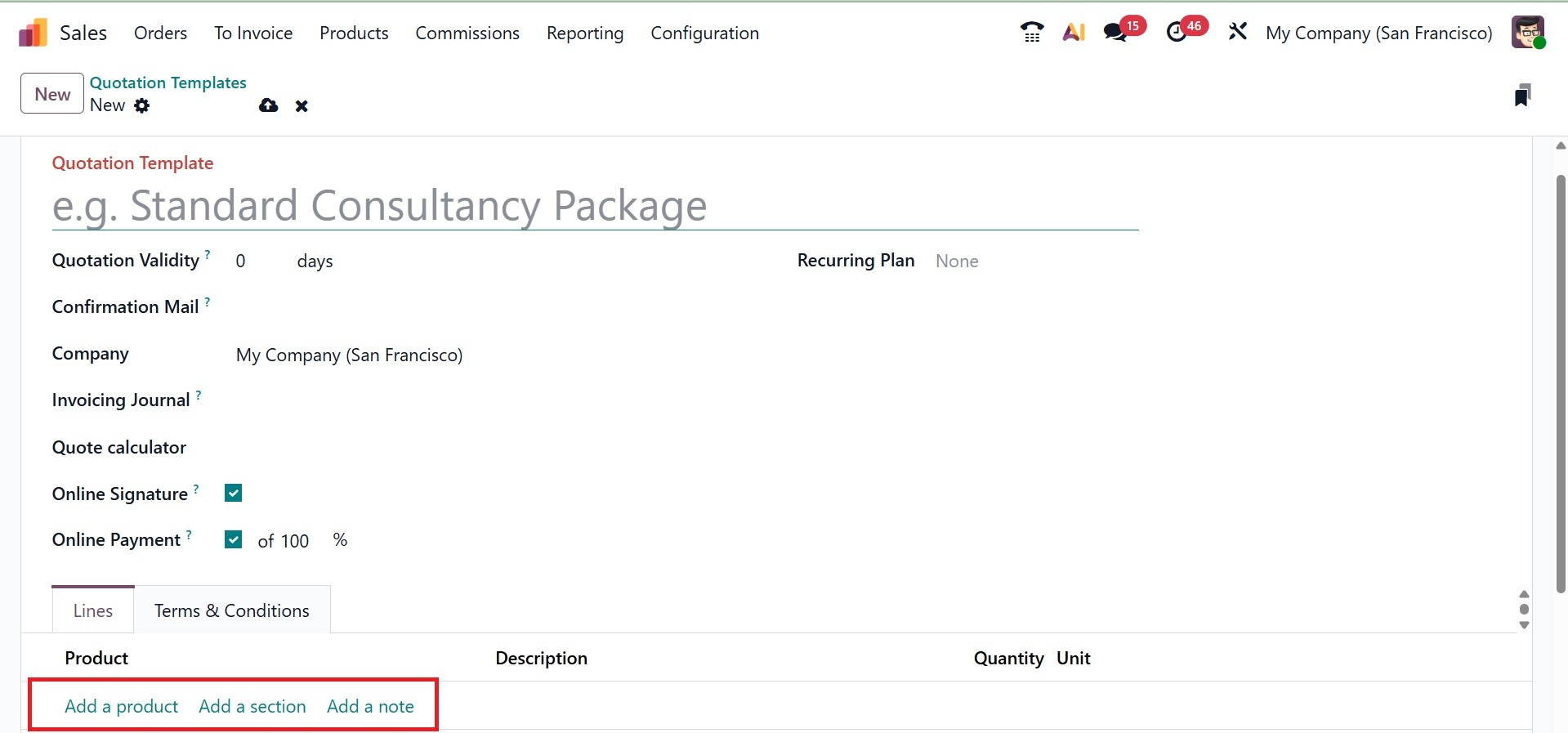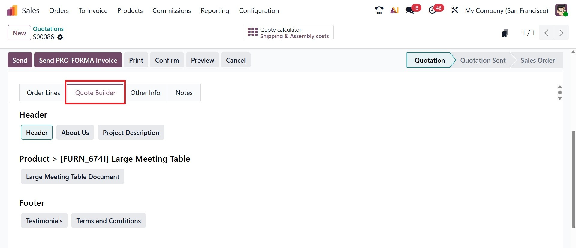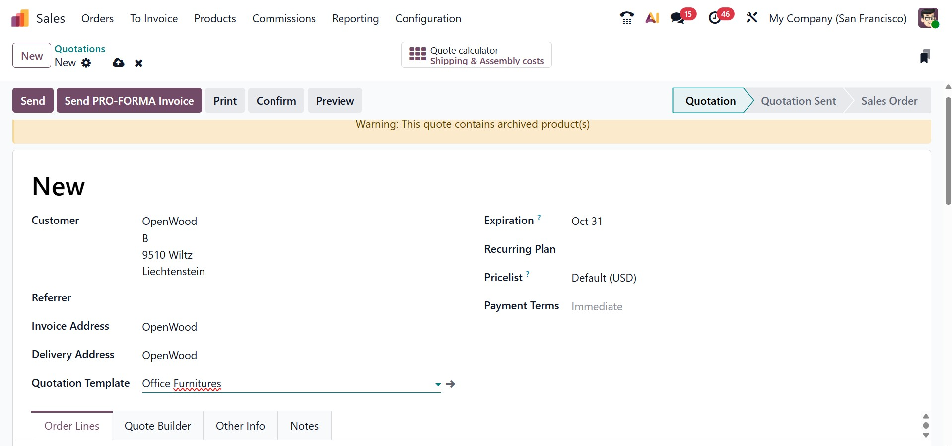 Now, create a new quotation from the order’s menu, and provide a quotation template in the allotted space.