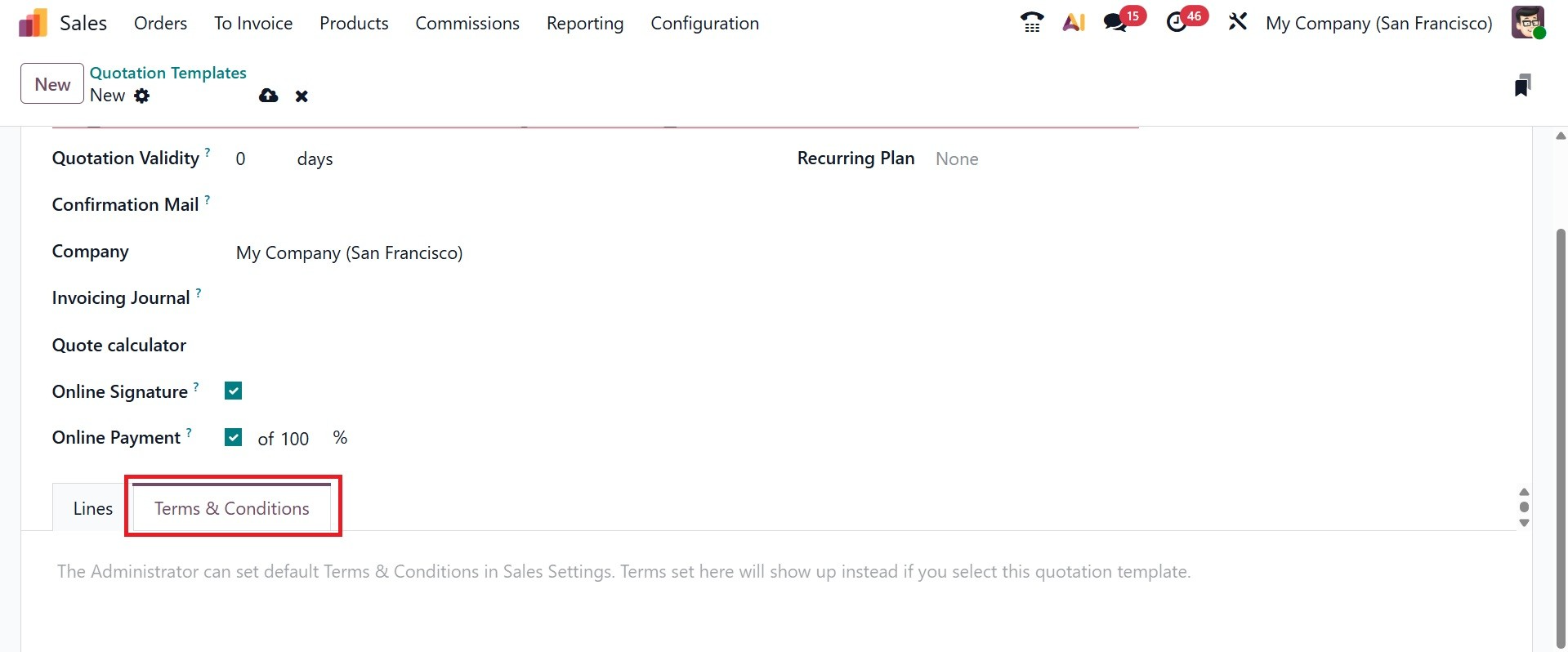The Terms & Conditions tab allows you to specify the terms and conditions that apply to this quotation template.