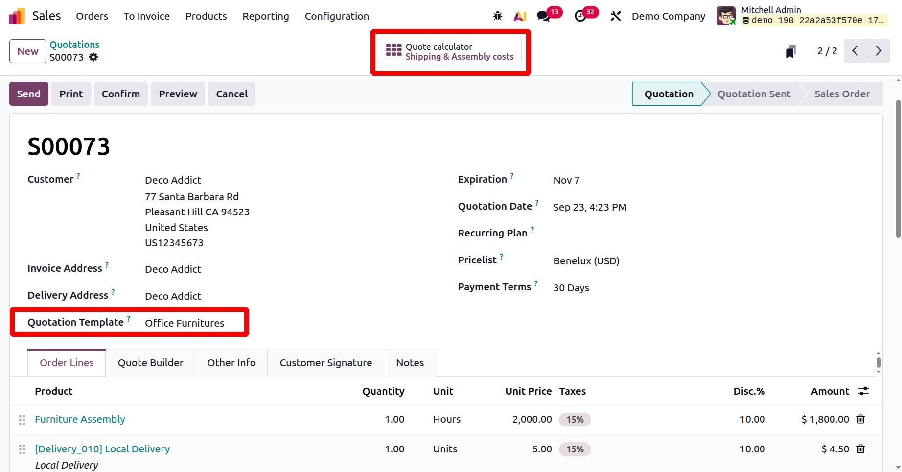 - QuoteCalculator: The "quote calculator" tool automatically calculates and displays exact pricing based on established rules, product configurations, quantities, and other dynamic parameters using Odoo's spreadsheet application.