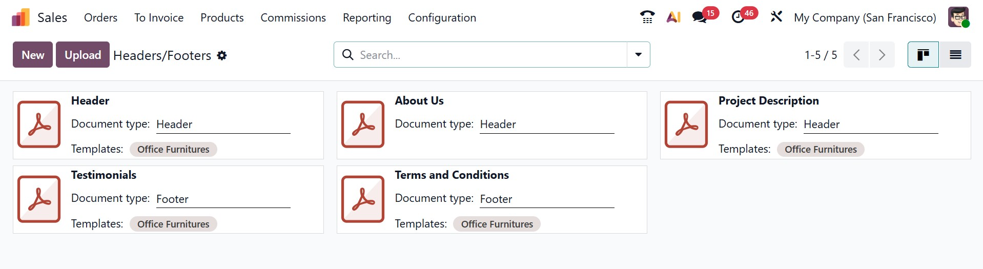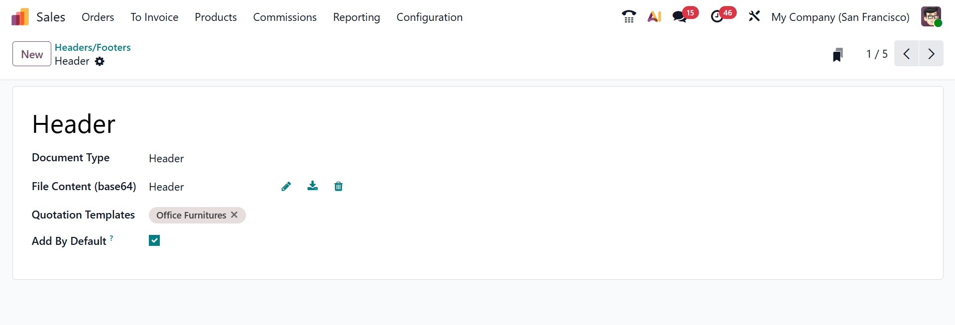 The Headers/Footers option in Odoo Sales' Configuration menu allows you to alter the company's branding and legal information that is automatically displayed on sales-related documents such as invoices, sales orders, and quotations. You can specify the standard header (such as the company name, logo, slogan, and address) and footer (such as the legal terms, registration information, disclaimers, or signature lines) that will be used uniformly in all printed or PDF reports produced by the Sales module using this parameter. The page provides the headers/footers, as in the screenshot below.
