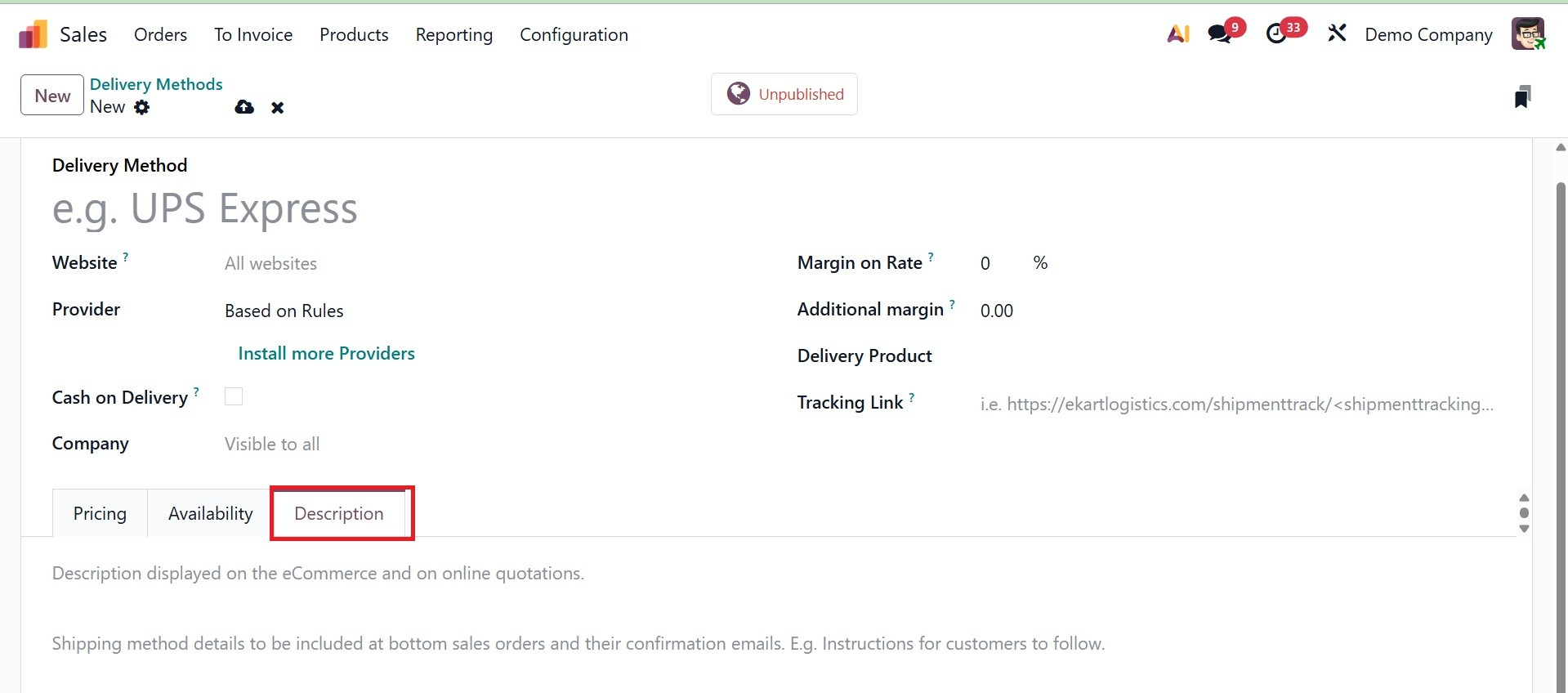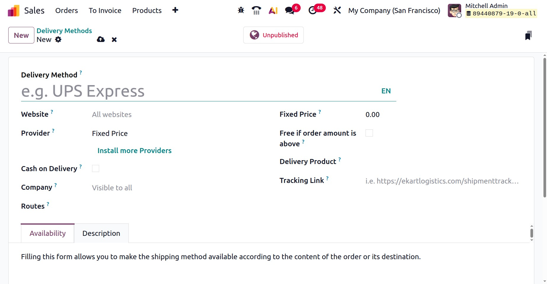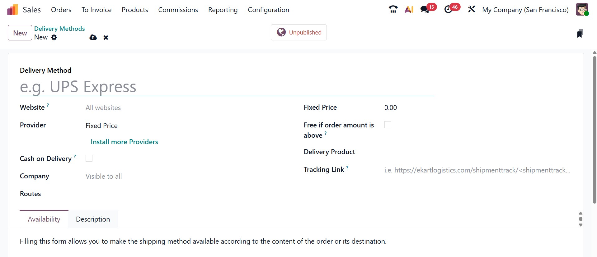 Click New to add a method to the Delivery Methods page. By doing this, a form requesting information about the delivery supplier is opened, containing: