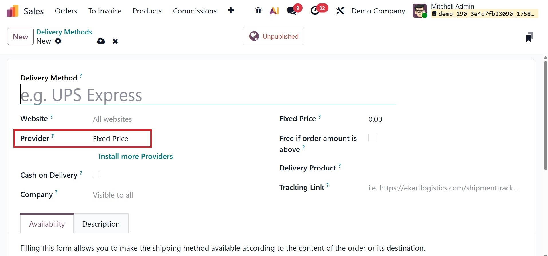 - Provider: (Required field): if using a third-party carrier, select the delivery service, such as FedEx. Make sure the shipping carrier integration is implemented correctly, then choose the provider from the drop-down option. See the corresponding sections below for further information on setting up bespoke delivery alternatives, such as fixed price or based on rules.