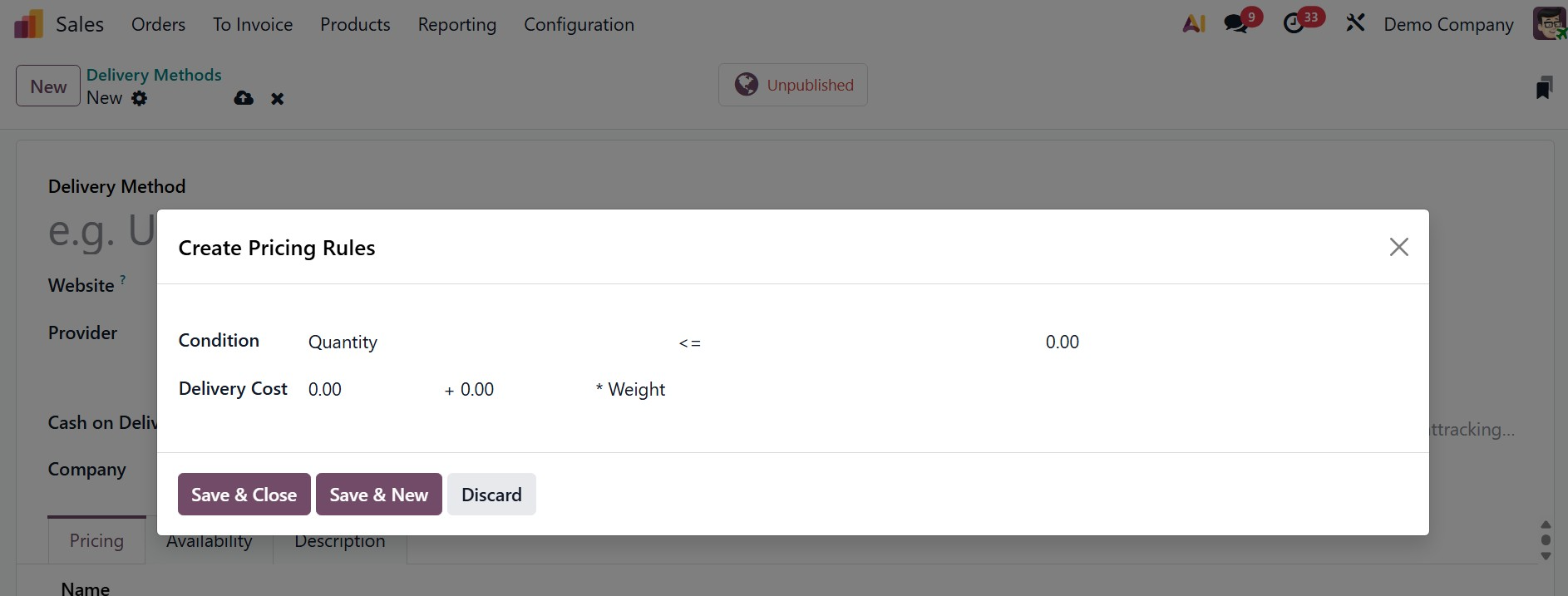 On the Pricing tab, select "Add a line." By doing this, the Create Pricing Rules window is opened, where the Delivery Cost is determined by comparing the Condition pertaining to the product's weight, volume, price, or quantity to a predetermined amount, as shown below.