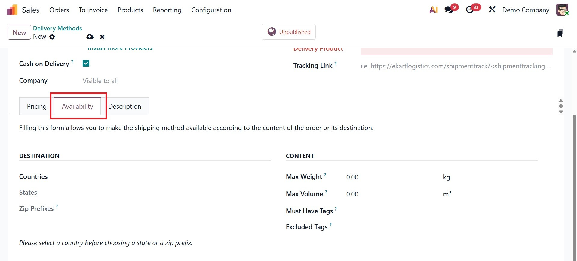 In the delivery method form, select the Availability tab and specify the Countries, States, and Zip Prefixes to limit shipping to particular destinations. And can add the max weight, max volume, must have tags, and excluded tags options under contents section. If every place is applicable, leave these entries blank.
