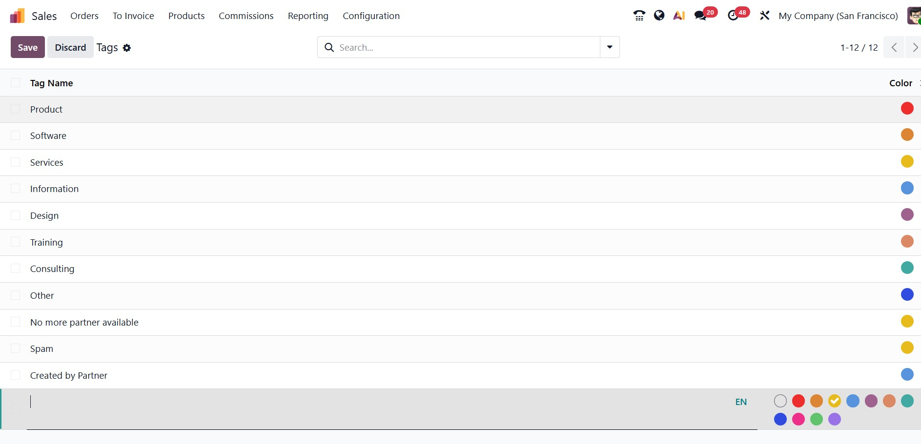 Adding tags to actions when saving them to your database will always help you get the data more quickly when you need it. Odoo 19 allows you to filter the preset operations by applying tags to them. The Configuration menu in the Odoo 19 Sales module makes it simple to set up these sales tags for the sales operations.