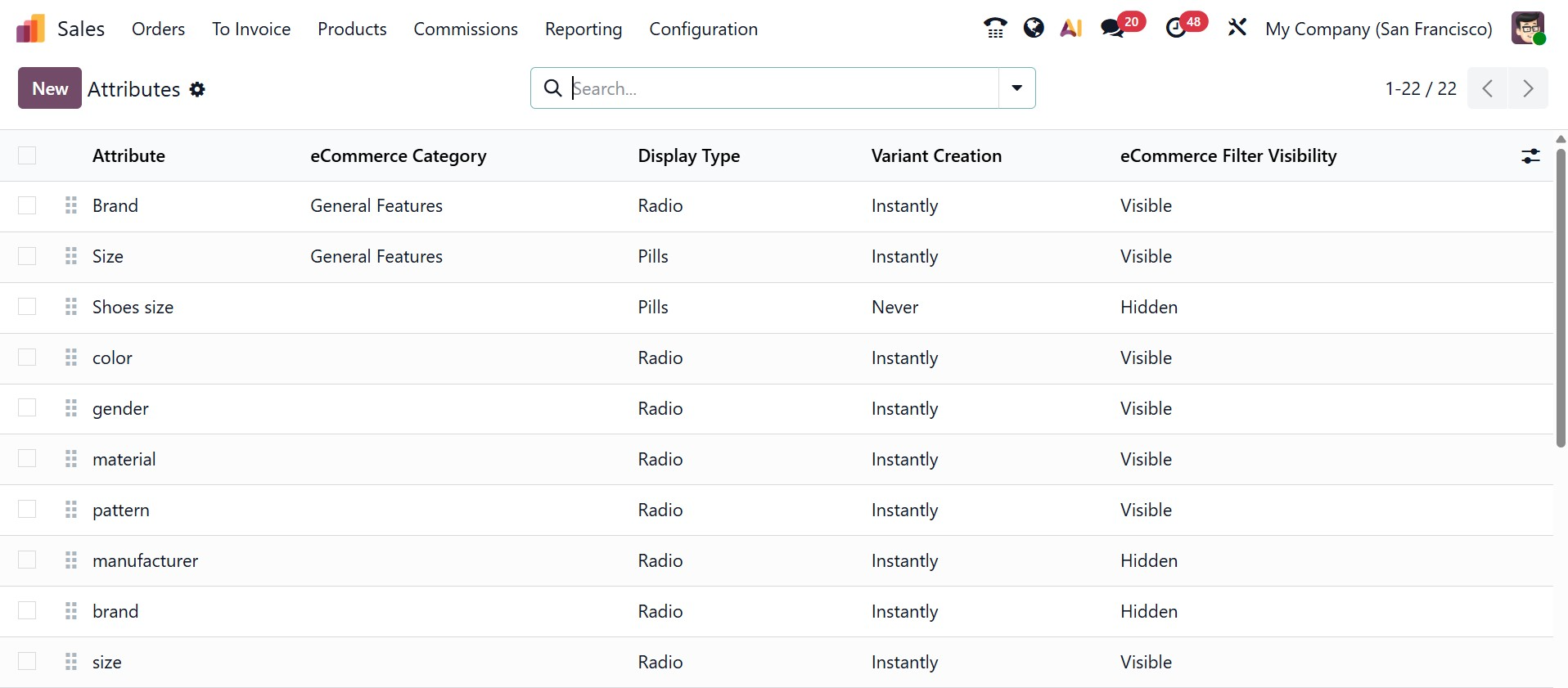 You can see every attribute that has ever been generated in the Odoo system in this window. All of the attributes will be listed in the window, along with the attribute name, eCommerce Filter Visibility, Category, Display Type, and Variants Creation Mode. If necessary, you can also add more custom fields. You can enter the Attribute creation window by clicking the New button on the upper left, as seen in the illustration below.