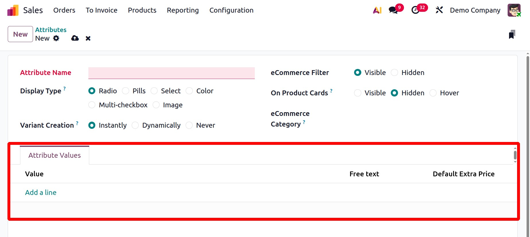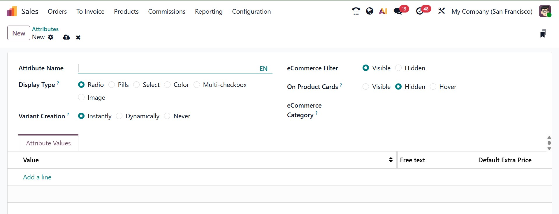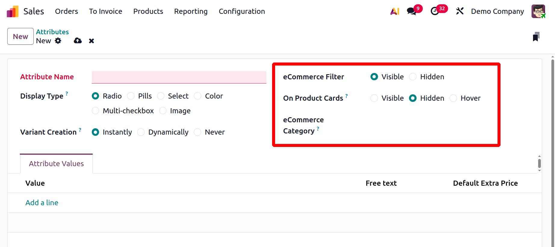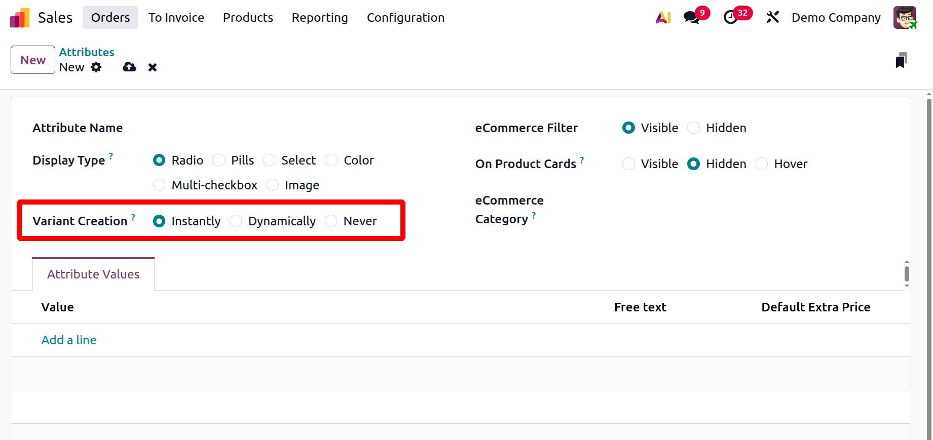 You can first enter the attribute name in the creation box, and then you can create a category to gather related attributes under the same section on the eCommerce comparison page. After that, you may select the Display Type from the list of possibilities, which includes Radio, Pills, Select, and Color. Additionally, there are three possibilities for the Variants Creation Mode: Instantly, Dynamically, and Never.