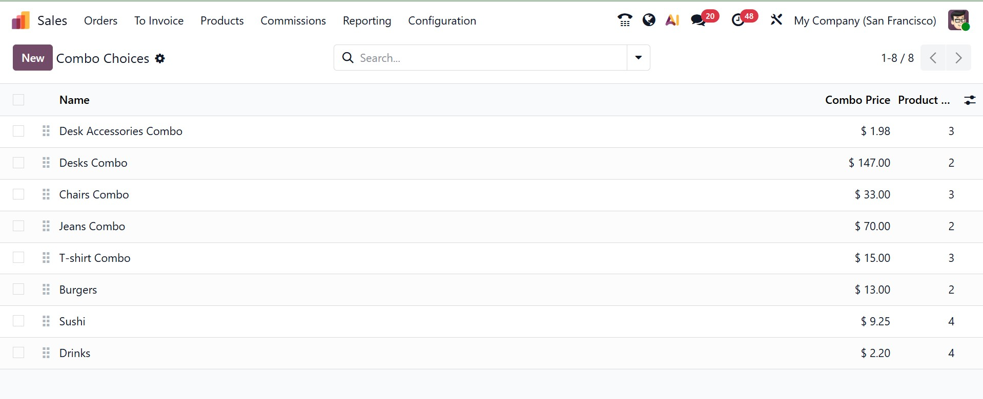 Under Odoo sales, we may design the combo options. For that, navigate to Combo Choices under the Configuration menu.