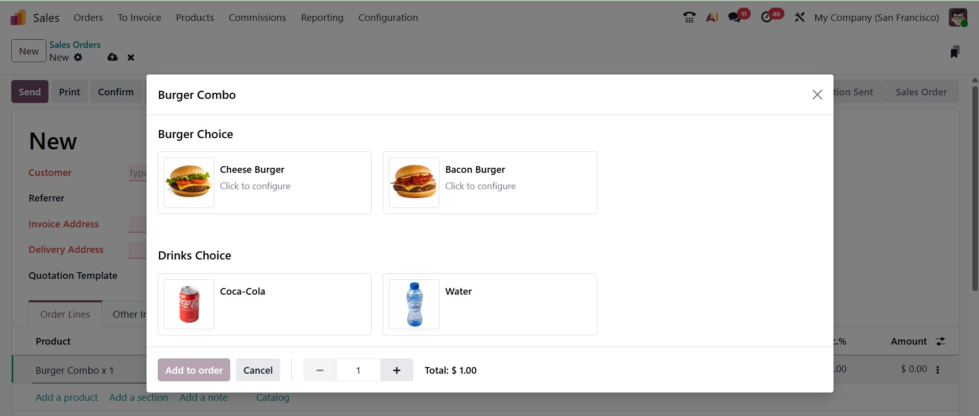 Afterward, a pop-up window allowing the user to select from the available products appears when a combo product is chosen on the sale order line.