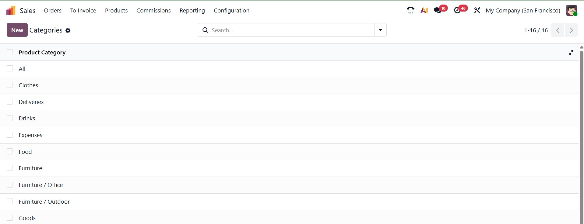 The Odoo In Sales module's Categories functionality allows you to group your products into several categories. Product categories must be defined in Odoo in order to carry out different types of product actions. Because Odoo lets you filter by product categories, it will make it easy to find the products. As seen below, the Configuration menu of the Sales module will provide the user with access to the Categories window.