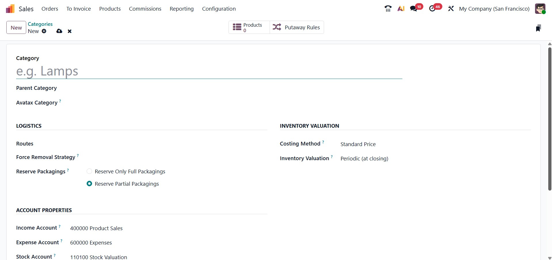 This window offers a number of pre-configured categories, including All, Consumable, Deliveries, Rental, Saleable, Internal, External, and many more. Let's use the New button to create a new category. To set up a new category, Odoo will take you to a new window, as seen in the screenshot below.