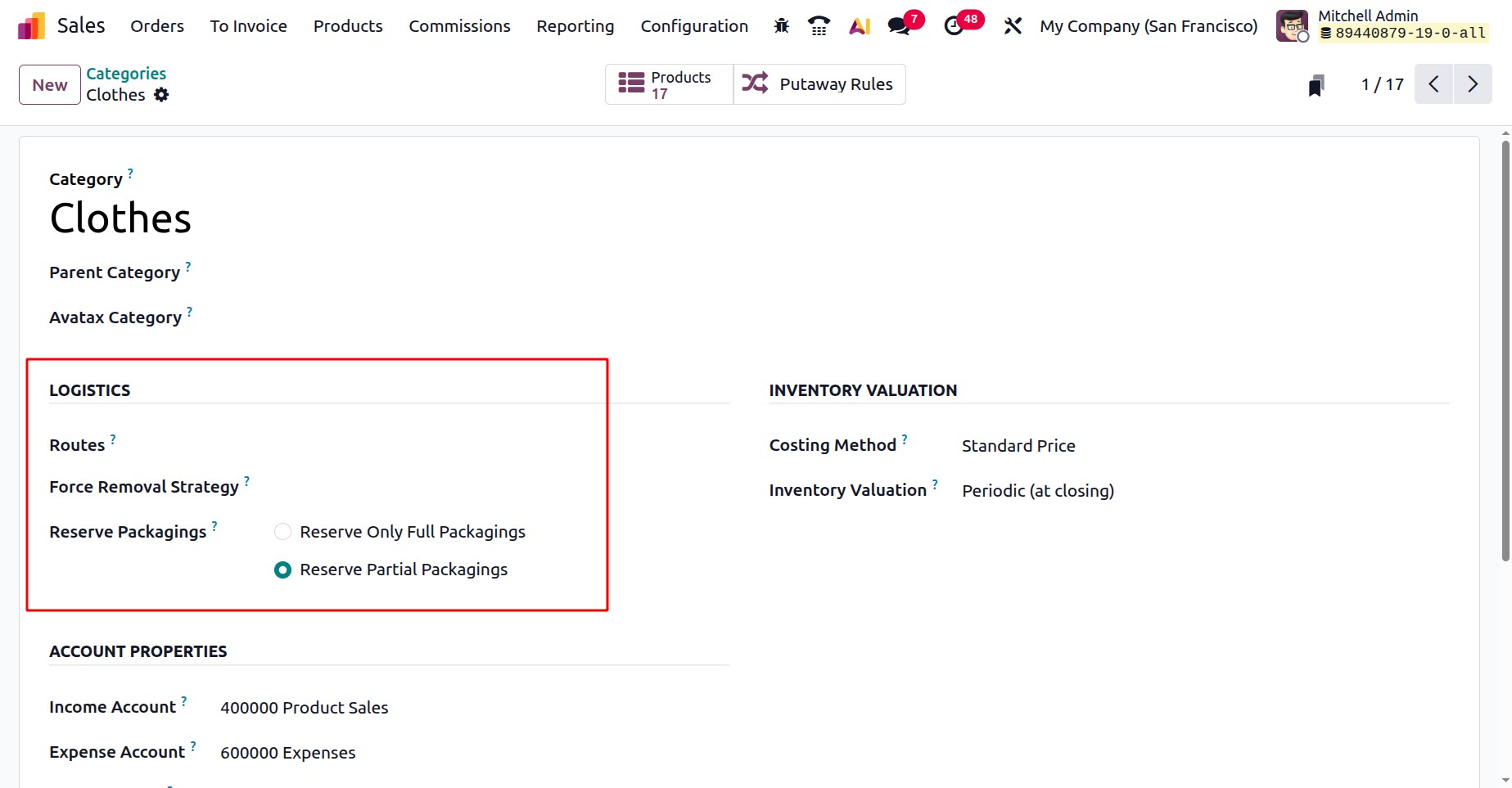 You can specify the routes of operation for this product category under the Logistics tab. You can provide a removal method in the Force Removal Strategy box that will be used regardless of where this product's source is located. Reserve Partial Packaging or Reserve Only Full Packaging are two options for the Reserve Packaging.