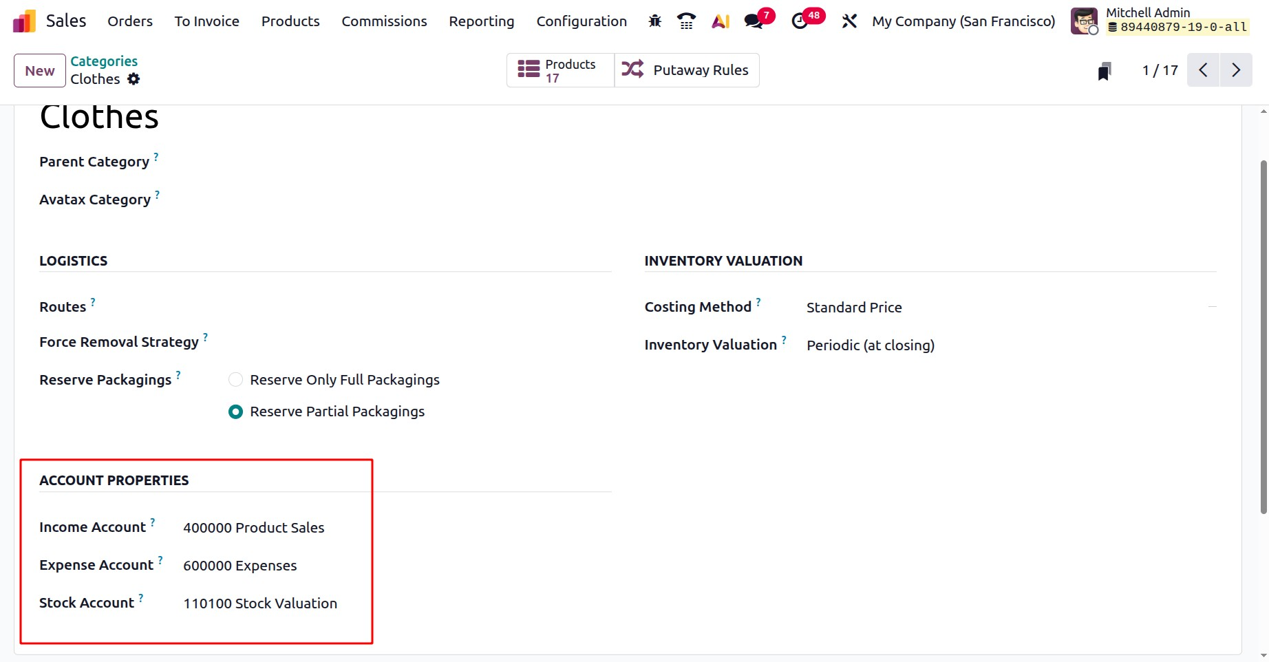 You can designate the Income Account and Expense Account in the corresponding fields on the Accounting Properties tab. Moreover, the Stock Account details can also be added below that. When a customer invoice is validated, the income account will be used, and when a vendor bill is validated, the expense account will be recorded.