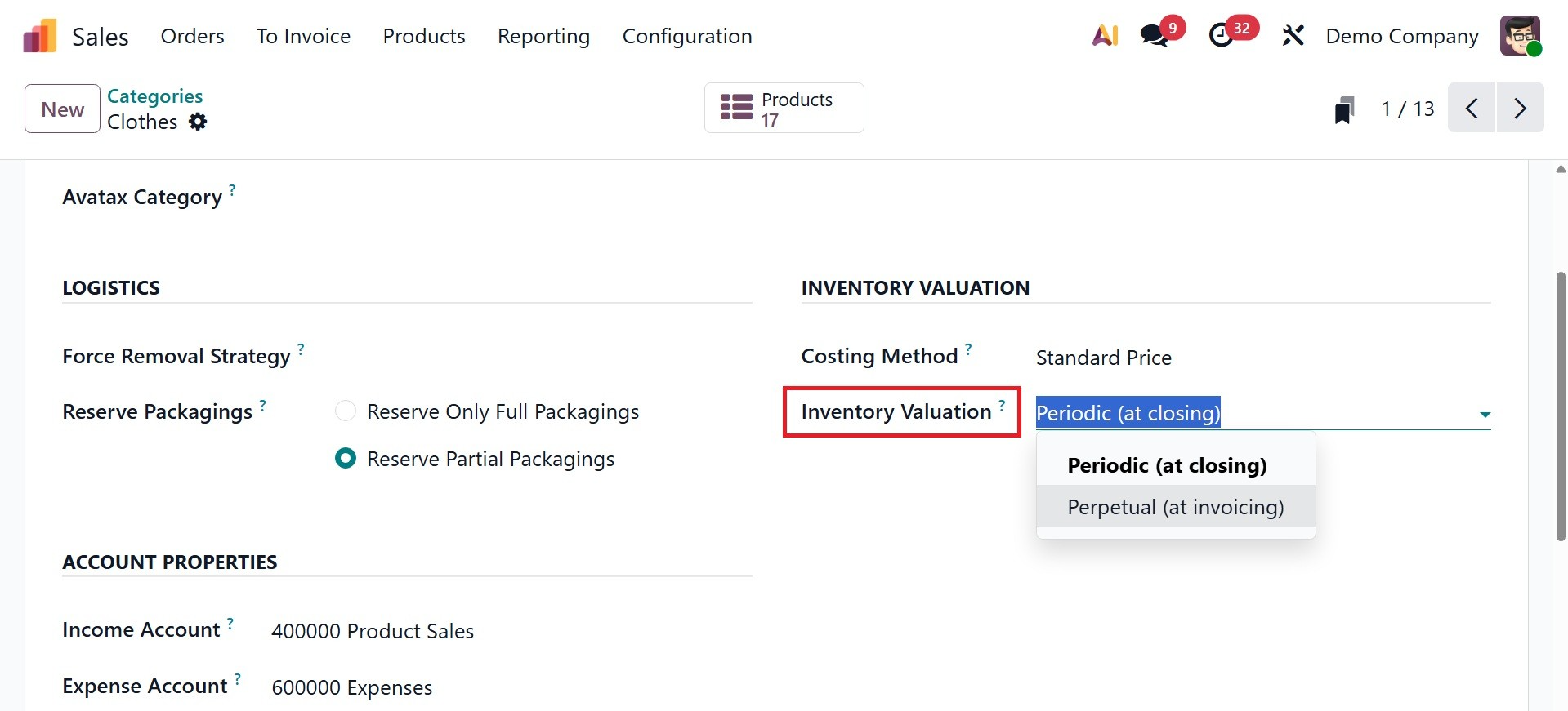 Depending on your needs, you can choose to have the product category's inventory valuation done periodically or perpetual, as in the screenshot below.