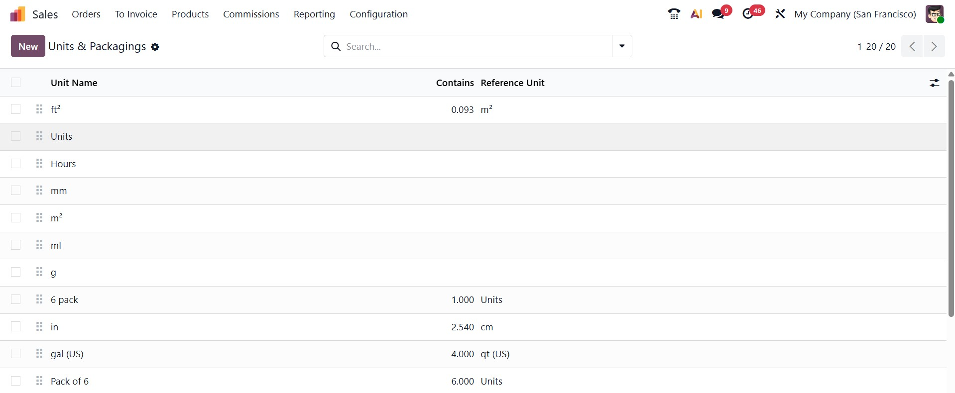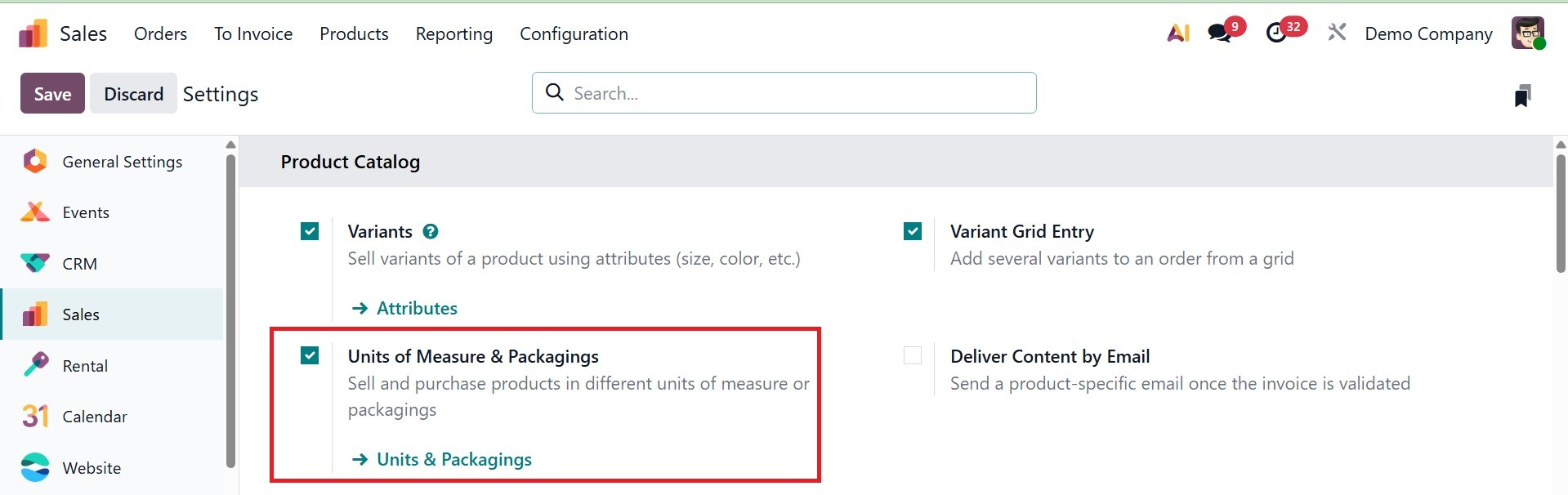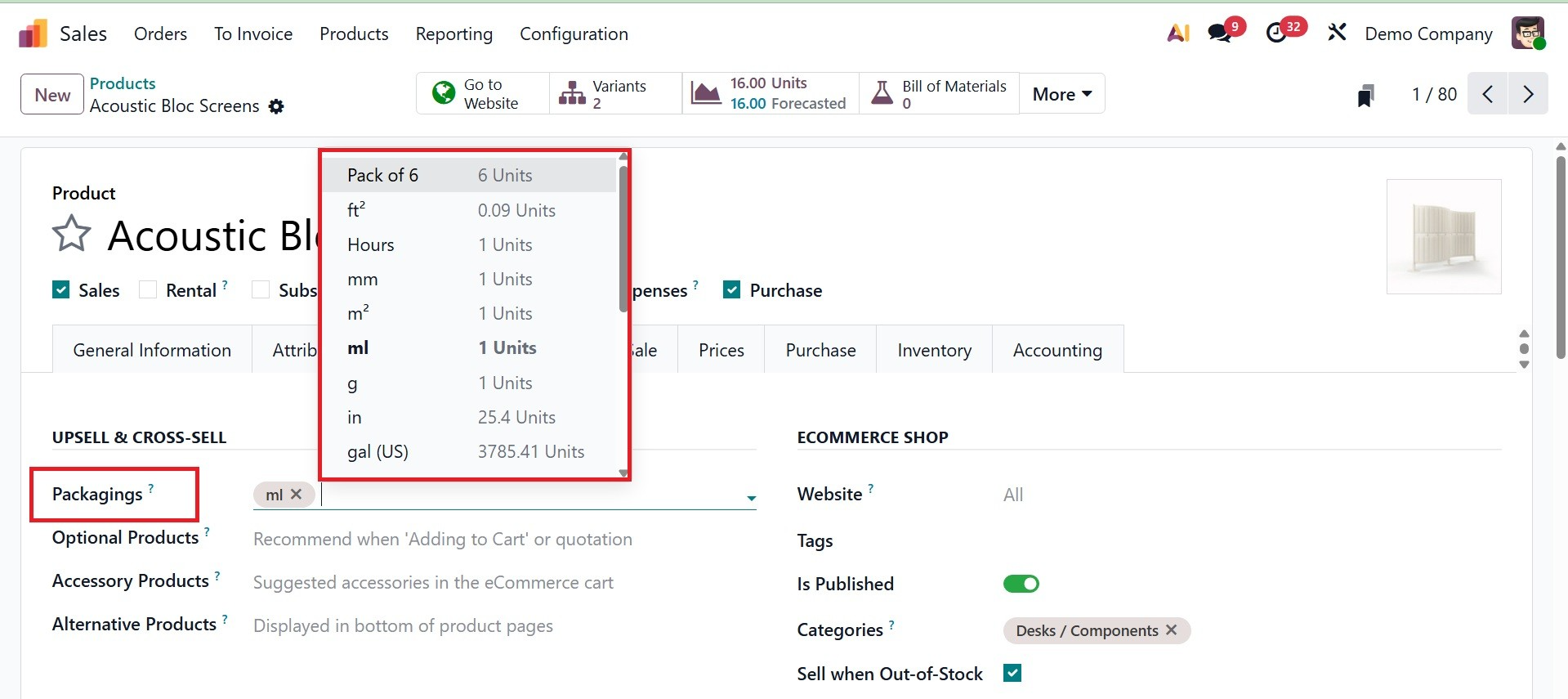 The options can be viewed under the Sales tab of Products Menu, where both units of measure and Packaging details comes together.