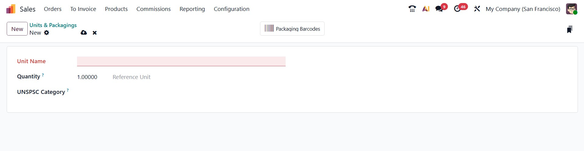 In Odoo 19, both units of measure and packaging come under a single option, where in the creation page, you can add the details like Unit name, Quantity, and UNPSC categories, respectively, as in the screenshot below.