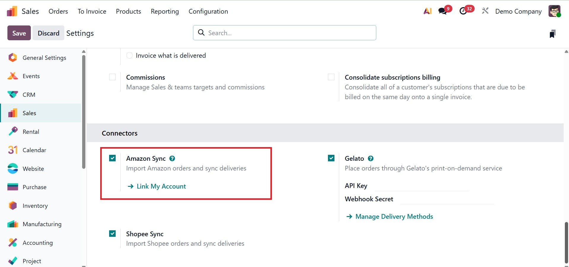 Go to the Sales app ‣ Configuration ‣ Settings ‣ Connectors section, turn on the Amazon Sync option, and then click Save to link an Amazon Seller account in Odoo 19, as in the screenshot below.