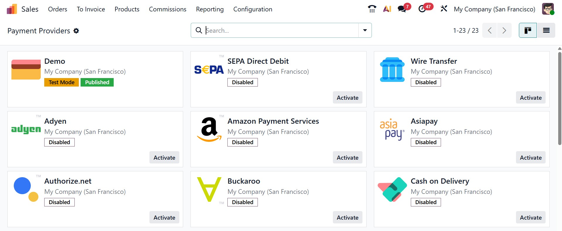 Several payment providers are integrated with Odoo, enabling your clients to make payments via your eCommerce website, their customer portals, or online. They can use their preferred payment methods, including credit cards, to settle sales orders, invoices, or subscriptions with recurring payments.