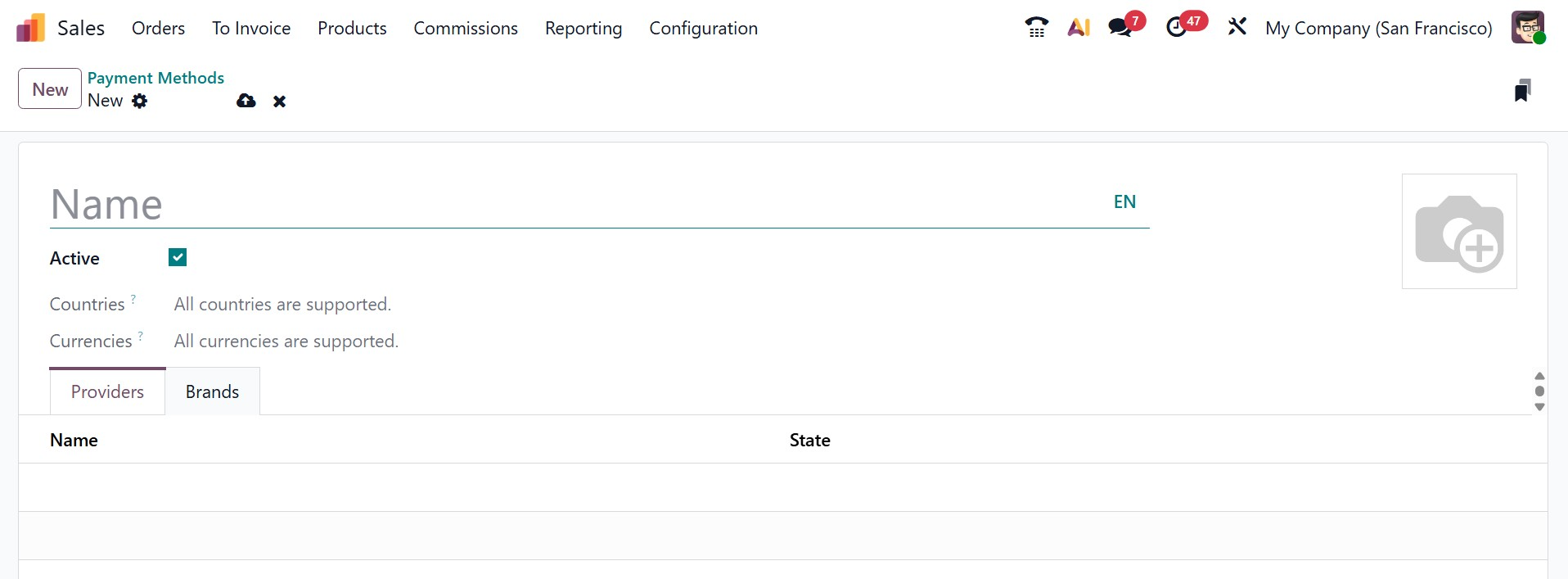 Here, you can provide the name for the payment method, enabling the Active option. Then, add the providers and brands for the payment method.
