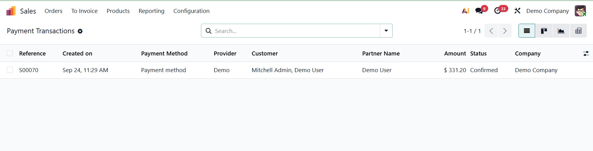 When a consumer pays for a sale, the process is referred to as a "payment transaction." This includes registering the payment and comparing it with the relevant sales order or invoice. In order to settle the amount owed on an invoice, generate customer credits for later use, or handle down payments, Odoo maintains these transactions, which may include manual payments or online payments made through payment gateways. The page of payment transactions will be, as in the image below.