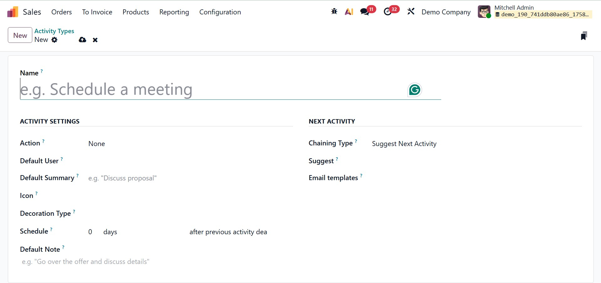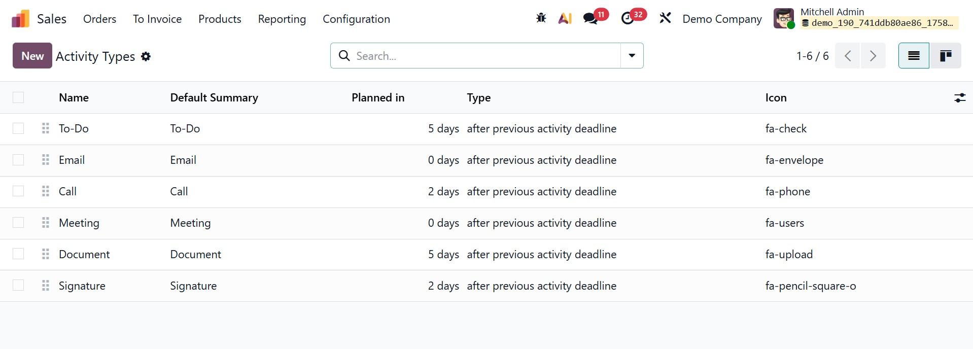 Go to the Configuration menu and choose the Activity Types option to set up activity types. Along with information like the activity name, default summary, scheduled duration, type, model, and related icons, this menu offers a range of pre-configured activity kinds. Clicking the New button will allow you to create a new activity type. Enter the activity's name in the designated field at the beginning of the creation window.
